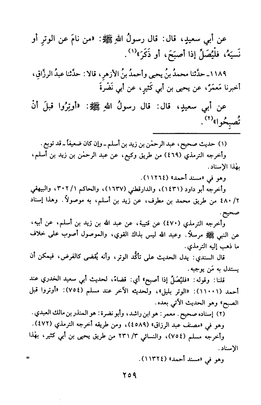 1189- حَدَّثَنَا مُحَمَّدُ بْنُ يَحْيَى ، وَأَحْمَدُ بْنُ الأَزْهَرِ ، قَالاَ : حَدَّثَنَا عَبْدُ الرَّزَّاقِ ، أَخْبَرَنَا مَعْمَرٌ ، عَنْ يَحْيَى بْنِ أَبِي كَثِيرٍ ، عَنْ أَبِي نَضْرَةَ ، عَنْ أَبِي سَعِيدٍ ، قَالَ : قَالَ رَسُولُ اللهِ صَلَّى الله عَليْهِ وسَلَّمَ : أَوْتِرُوا قَبْلَ أَنْ تُصْبِحُوا.