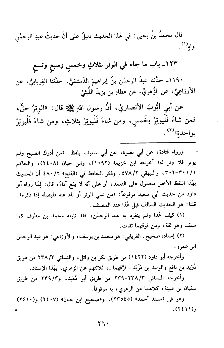 1190- حَدَّثَنَا عَبْدُ الرَّحْمَنِ بْنُ إِبْرَاهِيمَ الدِّمَشْقِيُّ ، حَدَّثَنَا الْفِرْيَابِيُّ ، عَنِ الأَوْزَاعِيِّ ، عَنِ الزُّهْرِيِّ ، عَنْ عَطَاءِ بْنِ يَزِيدَ اللَّيْثِيِّ ، عَنْ أَبِي أَيُّوبَ الأَنْصَارِيِّ ، أَنَّ رَسُولَ اللهِ صَلَّى الله عَليْهِ وسَلَّمَ قَالَ : الْوِتْرُ حَقٌّ ، فَمَنْ شَاءَ فَلْيُوتِرْ بِخَمْسٍ ، وَمَنْ شَاءَ فَلْيُوتِرْ بِثَلاَثٍ ، وَمَنْ شَاءَ فَلْيُوتِرْ بِوَاحِدَةٍ.