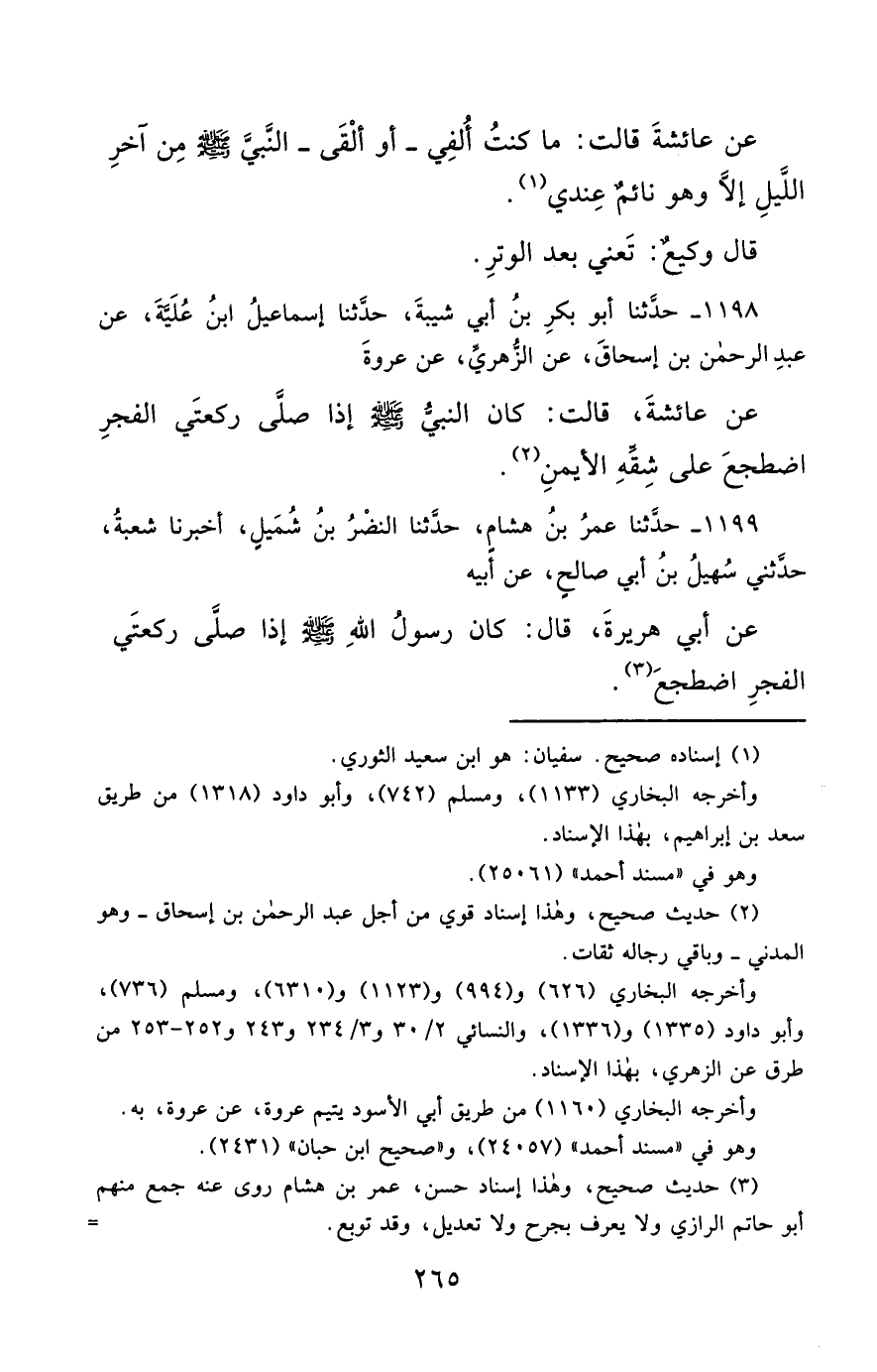 1198- حَدَّثَنَا أَبُو بَكْرِ بْنُ أَبِي شَيْبَةَ ، حَدَّثَنَا إِسْمَاعِيلُ ابْنُ عُلَيَّةَ ، عَنْ عَبْدِ الرَّحْمَنِ بْنِ إِسْحَاقَ ، عَنِ الزُّهْرِيِّ ، عَنْ عُرْوَةَ ، عَنْ عَائِشَةَ ، قَالَتْ : كَانَ النَّبِيُّ صَلَّى الله عَليْهِ وسَلَّمَ إِذَا صَلَّى رَكْعَتَيِ الْفَجْرِ اضْطَجَعَ عَلَى شِقِّهِ الأَيْمَنِ.