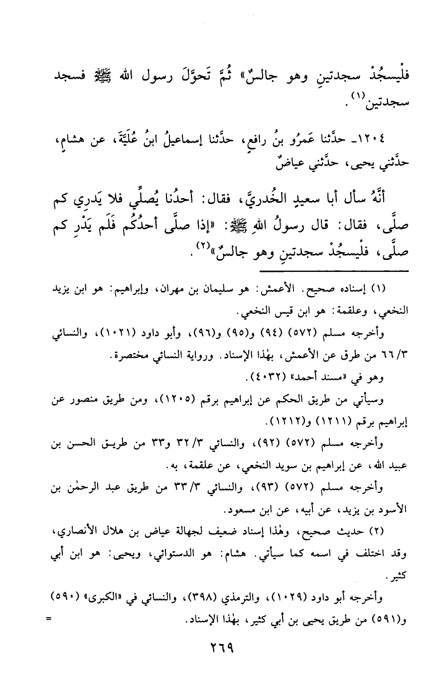 1204- حَدَّثَنَا عَمْرُو بْنُ رَافِعٍ ، حَدَّثَنَا إِسْمَاعِيلُ ابْنُ عُلَيَّةَ ، عَنْ هِشَامٍ , حَدَّثَنِي يَحْيَى , حَدَّثَنِي عِيَاضٌ ، أَنَّهُ سَأَلَ أَبَا سَعِيدٍ الْخُدْرِيَّ ، فَقَالَ : أَحَدُنَا يُصَلِّي فَلاَ يَدْرِي كَمْ صَلَّى ، فَقَالَ : قَالَ رَسُولُ اللهِ صَلَّى الله عَليْهِ وسَلَّمَ : إِذَا صَلَّى أَحَدُكُمْ فَلَمْ يَدْرِ كَمْ صَلَّى ، فَلْيَسْجُدْ سَجْدَتَيْنِ وَهُوَ جَالِسٌ.