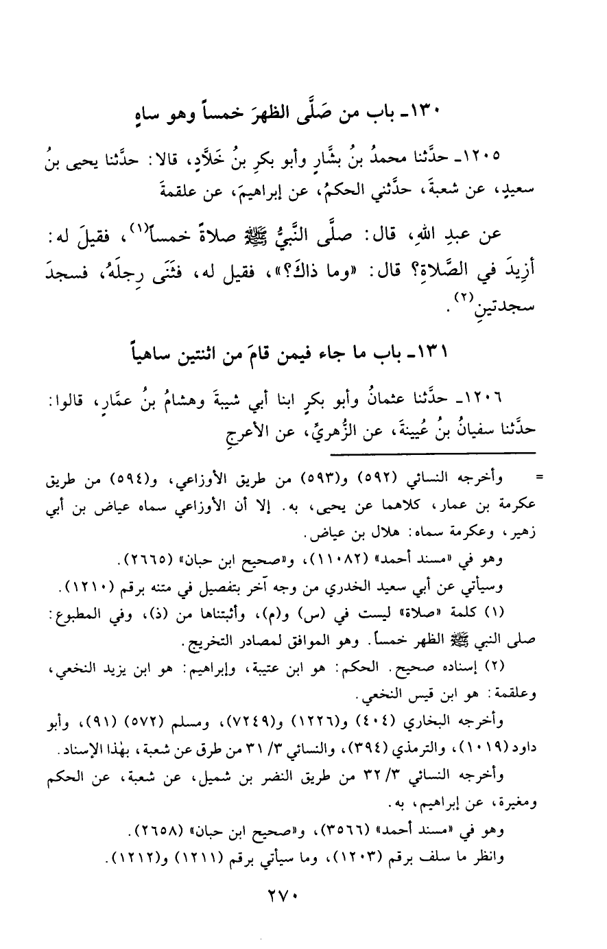 1205- حَدَّثَنَا مُحَمَّدُ بْنُ بَشَّارٍ ، وَأَبُو بَكْرِ بْنُ خَلاَّدٍ ، قَالاَ : حَدَّثَنَا يَحْيَى بْنُ سَعِيدٍ ، عَنْ شُعْبَةَ , حَدَّثَنِي الْحَكَمُ ، عَنْ إِبْرَاهِيمَ ، عَنْ عَلْقَمَةَ ، عَنْ عَبْدِ اللهِ ، قَالَ : صَلَّى النَّبِيُّ صَلَّى الله عَليْهِ وسَلَّمَ صَلاَةً خَمْسًا ، فَقِيلَ لَهُ : أَزِيدَ فِي الصَّلاَةِ ؟ قَالَ : وَمَا ذَاكَ ؟ فَقِيلَ لَهُ ، فَثَنَى رِجْلَهُ ، فَسَجَدَ سَجْدَتَيْنِ.