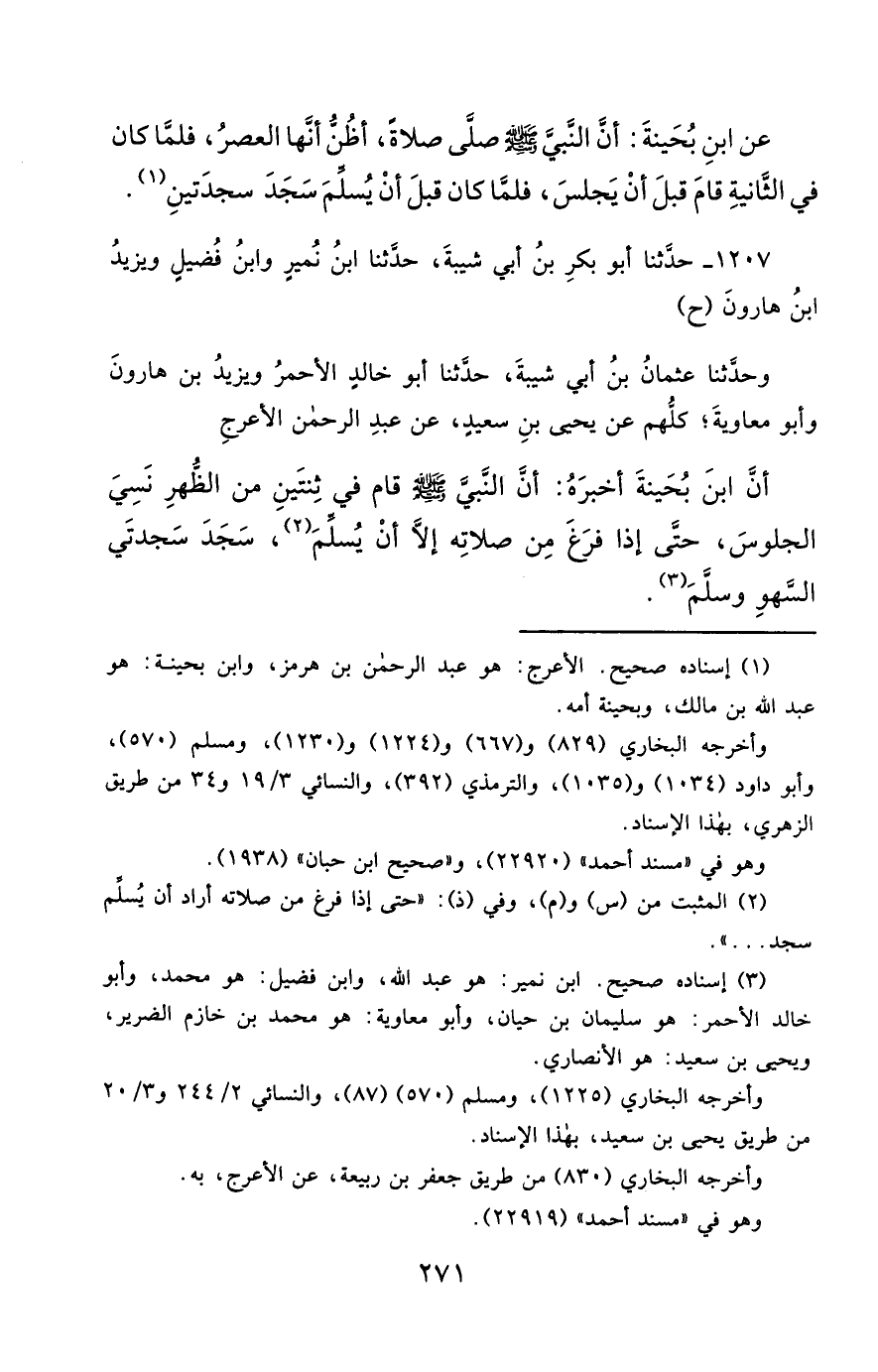 1207- حَدَّثَنَا أَبُو بَكْرِ بْنُ أَبِي شَيْبَةَ ، حَدَّثَنَا ابْنُ نُمَيْرٍ ، وَابْنُ فُضَيْلٍ ، وَيَزِيدُ بْنُ هَارُونَ (ح) وَحَدَّثَنَا عُثْمَانُ بْنُ أَبِي شَيْبَةَ ، حَدَّثَنَا أَبُو خَالِدٍ الأَحْمَرُ ، وَيَزِيدُ بْنُ هَارُونَ ، وَأَبُو مُعَاوِيَةَ ، كُلُّهُمْ عَنْ يَحْيَى بْنِ سَعِيدٍ ، عَنْ عَبْدِ الرَّحْمَنِ الأَعْرَجِ ، أَنَّ ابْنَ بُحَيْنَةَ أَخْبَرَهُ , أَنَّ النَّبِيَّ صَلَّى الله عَليْهِ وسَلَّمَ قَامَ فِي ثِنْتَيْنِ مِنَ الظُّهْرِ نَسِيَ الْجُلُوسَ ، حَتَّى إِذَا فَرَغَ مِنْ صَلاَتِهِ إِلاَّ أَنْ يُسَلِّمَ ، سَجَدَ سَجْدَتَيِ السَّهْوِ وَسَلَّمَ.