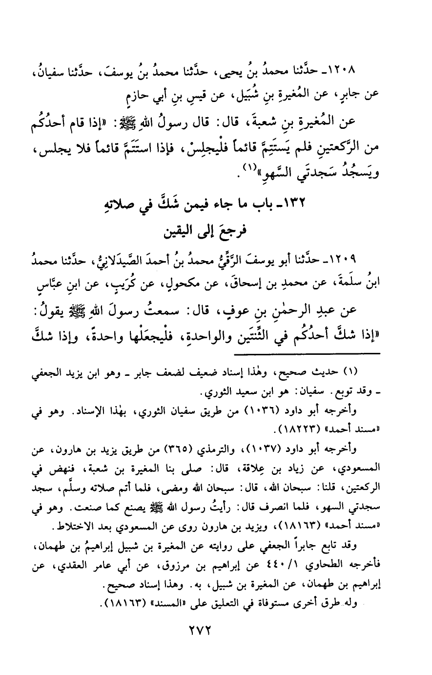 1208- حَدَّثَنَا مُحَمَّدُ بْنُ يَحْيَى ، حَدَّثَنَا مُحَمَّدُ بْنُ يُوسُفَ ، حَدَّثَنَا سُفْيَانُ ، عَنْ جَابِرٍ ، عَنِ الْمُغِيرَةِ بْنِ شُبَيْلٍ ، عَنْ قَيْسِ بْنِ أَبِي حَازِمٍ ، عَنِ الْمُغِيرَةِ بْنِ شُعْبَةَ ، قَالَ : قَالَ رَسُولُ اللهِ صَلَّى الله عَليْهِ وسَلَّمَ : إِذَا قَامَ أَحَدُكُمْ مِنَ الرَّكْعَتَيْنِ فَلَمْ يَسْتَتِمَّ قَائِمًا فَلْيَجْلِسْ ، فَإِذَا اسْتَتَمَّ قَائِمًا , فَلاَ يَجْلِسْ وَيَسْجُدْ سَجْدَتَيِ السَّهْوِ.