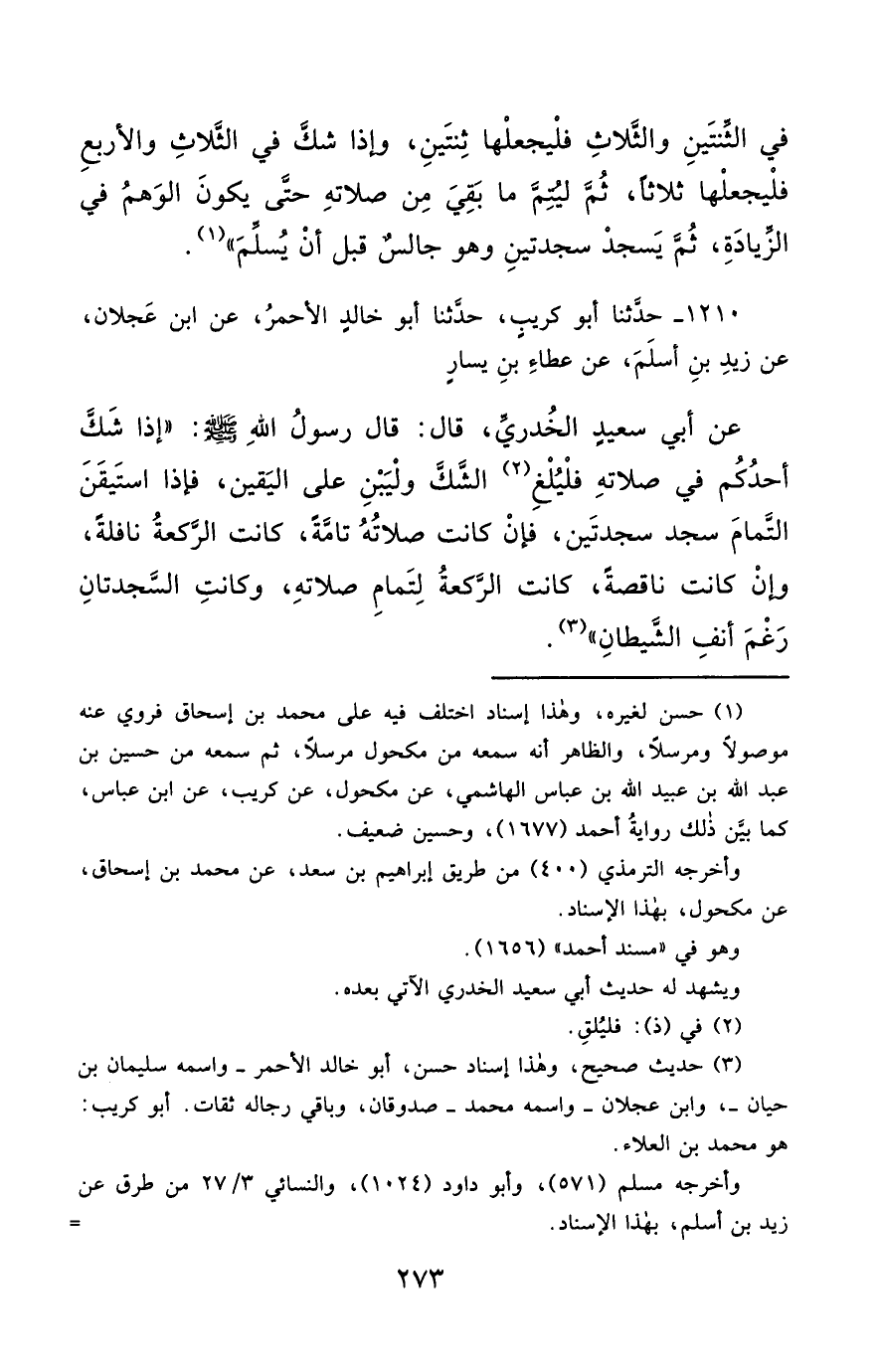 1210- حَدَّثَنَا أَبُو كُرَيْبٍ ، حَدَّثَنَا أَبُو خَالِدٍ الأَحْمَرُ ، عَنِ ابْنِ عَجْلاَنَ ، عَنْ زَيْدِ بْنِ أَسْلَمَ ، عَنْ عَطَاءِ بْنِ يَسَارٍ ، عَنْ أَبِي سَعِيدٍ الْخُدْرِيِّ ، قَالَ : قَالَ رَسُولُ اللهِ صَلَّى الله عَليْهِ وسَلَّمَ : إِذَا شَكَّ أَحَدُكُمْ فِي صَلاَتِهِ , فَلْيُلْغِ الشَّكَّ وَلْيَبْنِ عَلَى الْيَقِينِ ، فَإِذَا اسْتَيْقَنَ التَّمَامَ سَجَدَ سَجْدَتَيْنِ ، فَإِنْ كَانَتْ صَلاَتُهُ تَامَّةً ، كَانَتِ الرَّكْعَةُ نَافِلَةً ، وَإِنْ كَانَتْ نَاقِصَةً ، كَانَتِ الرَّكْعَةُ لِتَمَامِ صَلاَتِهِ ، وَكَانَتِ السَّجْدَتَانِ رَغْمَ أَنْفِ الشَّيْطَانِ.
