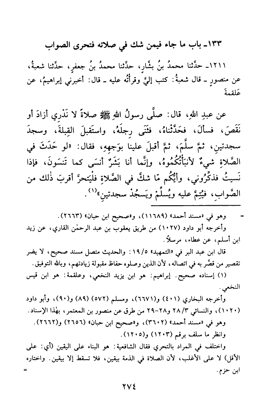 1211- حَدَّثَنَا مُحَمَّدُ بْنُ بَشَّارٍ ، حَدَّثَنَا مُحَمَّدُ بْنُ جَعْفَرٍ ، حَدَّثَنَا شُعْبَةُ ، عَنْ مَنْصُورٍ ، قَالَ شُعْبَةُ : كَتَبَ إِلَيَّ وَقَرَأْتُهُ عَلَيْهِ ، قَالَ : أَخْبَرَنِي إِبْرَاهِيمُ ، عَنْ عَلْقَمَةَ ، عَنْ عَبْدِ اللهِ , قَالَ : صَلَّى رَسُولُ اللهِ صَلَّى الله عَليْهِ وسَلَّمَ صَلاَةً , لاَ نَدْرِي أَزَادَ أَوْ نَقَصَ , فَسَأَلَ ، فَحَدَّثْنَاهُ , فَثَنَى رِجْلَهُ ، وَاسْتَقْبَلَ الْقِبْلَةَ ، وَسَجَدَ سَجْدَتَيْنِ ، ثُمَّ سَلَّمَ ، ثُمَّ أَقْبَلَ عَلَيْنَا بِوَجْهِهِ ، فَقَالَ : لَوْ حَدَثَ فِي الصَّلاَةِ شَيْءٌ لأَنْبَأْتُكُمُوهُ ، وَإِنَّمَا أَنَا بَشَرٌ أَنْسَى كَمَا تَنْسَوْنَ ، فَإِذَا نَسِيتُ فَذَكِّرُونِي ، وَأَيُّكُمْ مَا شَكَّ فِي الصَّلاَةِ , فَلْيَتَحَرَّ أَقْرَبَ ذَلِكَ مِنَ الصَّوَابِ ، فَيُتِمَّ عَلَيْهِ , وَيُسَلِّمْ وَيَسْجُدْ سَجْدَتَيْنِ.