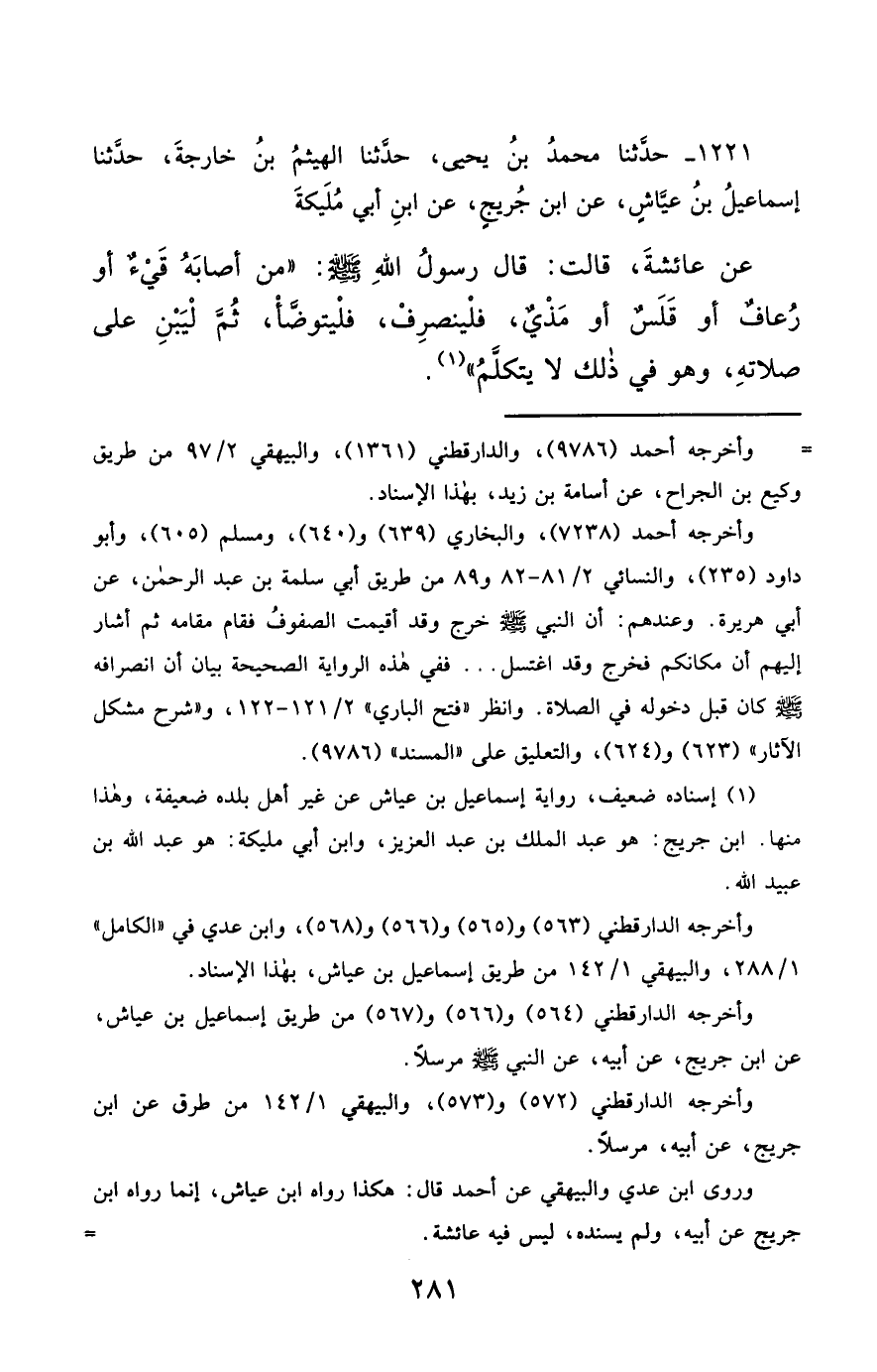 1221- حَدَّثَنَا مُحَمَّدُ بْنُ يَحْيَى ، حَدَّثَنَا الْهَيْثَمُ بْنُ خَارِجَةَ ، حَدَّثَنَا إِسْمَاعِيلُ بْنُ عَيَّاشٍ ، عَنِ ابْنِ جُرَيْجٍ ، عَنِ ابْنِ أَبِي مُلَيْكَةَ ، عَنْ عَائِشَةَ ، قَالَتْ : قَالَ رَسُولُ اللهِ صَلَّى الله عَليْهِ وسَلَّمَ : مَنْ أَصَابَهُ قَيْءٌ أَوْ رُعَافٌ أَوْ قَلَسٌ أَوْ مَذْيٌ ، فَلْيَنْصَرِفْ ، فَلْيَتَوَضَّأْ ثُمَّ لِيَبْنِ عَلَى صَلاَتِهِ ، وَهُوَ فِي ذَلِكَ لاَ يَتَكَلَّمُ.