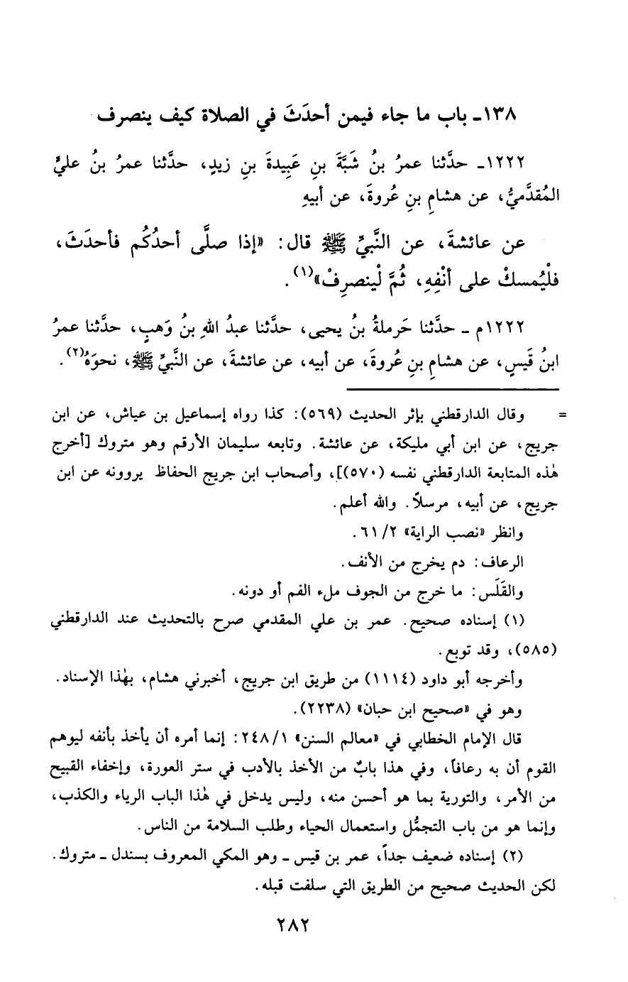 1222- حَدَّثَنَا عُمَرُ بْنُ شَبَّةَ بْنِ عَبِيدَةَ بْنِ زَيْدٍ ، حَدَّثَنَا عُمَرُ بْنُ عَلِيٍّ الْمُقَدَّمِيُّ ، عَنْ هِشَامِ بْنِ عُرْوَةَ ، عَنْ أَبِيهِ ، عَنْ عَائِشَةَ ، عَنِ النَّبِيِّ صَلَّى الله عَليْهِ وسَلَّمَ قَالَ : إِذَا صَلَّى أَحَدُكُمْ فَأَحْدَثَ ، فَلْيُمْسِكْ عَلَى أَنْفِهِ ، ثُمَّ لِيَنْصَرِفْ.