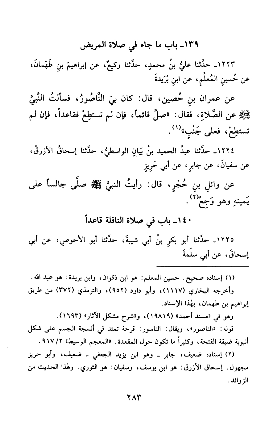 1223- حَدَّثَنَا عَلِيُّ بْنُ مُحَمَّدٍ ، حَدَّثَنَا وَكِيعٌ ، عَنْ إِبْرَاهِيمَ بْنِ طَهْمَانَ ، عَنْ حُسَيْنٍ الْمُعَلِّمِ ، عَنِ ابْنِ بُرَيْدَةَ ، عَنْ عِمْرَانَ بْنِ حُصَيْنٍ ، قَالَ : كَانَ بِيَ النَّاصُورُ ، فَسَأَلْتُ النَّبِيَّ صَلَّى الله عَليْهِ وسَلَّمَ عَنِ الصَّلاَةِ ، فَقَالَ : صَلِّ قَائِمًا ، فَإِنْ لَمْ تَسْتَطِعْ فَقَاعِدًا ، فَإِنْ لَمْ تَسْتَطِعْ ، فَعَلَى جَنْبٍ.