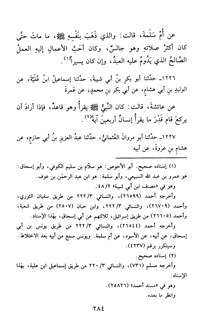 1226- حَدَّثَنَا أَبُو بَكْرِ بْنُ أَبِي شَيْبَةَ ، حَدَّثَنَا إِسْمَاعِيلُ ابْنُ عُلَيَّةَ ، عَنِ الْوَلِيدِ بْنِ أَبِي هِشَامٍ ، عَنْ أَبِي بَكْرِ بْنِ مُحَمَّدٍ ، عَنْ عَمْرَةَ ، عَنْ عَائِشَةَ ، قَالَتْ : كَانَ النَّبِيُّ صَلَّى الله عَليْهِ وسَلَّمَ يَقْرَأُ وَهُوَ قَاعِدٌ ، فَإِذَا أَرَادَ أَنْ يَرْكَعَ , قَامَ قَدْرَ مَا يَقْرَأُ إِنْسَانٌ أَرْبَعِينَ آيَةً.