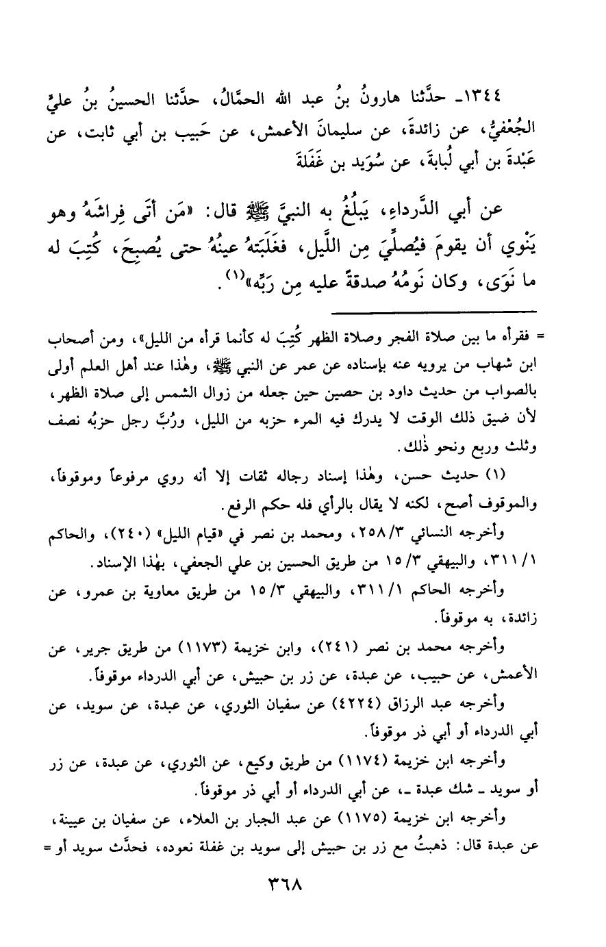 1344- حَدَّثَنَا هَارُونُ بْنُ عَبْدِ اللهِ الْحَمَّالُ ، حَدَّثَنَا الْحُسَيْنُ بْنُ عَلِيٍّ الْجُعْفِيُّ ، عَنْ زَائِدَةَ ، عَنْ سُلَيْمَانَ الأَعْمَشِ ، عَنْ حَبِيبِ بْنِ أَبِي ثَابِتٍ ، عَنْ عَبْدَةَ بْنِ أَبِي لُبَابَةَ ، عَنْ سُوَيْدِ بْنِ غَفَلَةَ ، عَنْ أَبِي الدَّرْدَاءِ ، يَبْلُغُ بِهِ النَّبِيَّ صَلَّى الله عَليْهِ وسَلَّمَ قَالَ : مَنْ أَتَى فِرَاشَهُ ، وَهُوَ يَنْوِي أَنْ يَقُومَ فَيُصَلِّيَ مِنَ اللَّيْلِ ، فَغَلَبَتْهُ عَيْنُهُ حَتَّى يُصْبِحَ ، كُتِبَ لَهُ مَا نَوَى ، وَكَانَ نَوْمُهُ صَدَقَةً عَلَيْهِ مِنْ رَبِّهِ.
