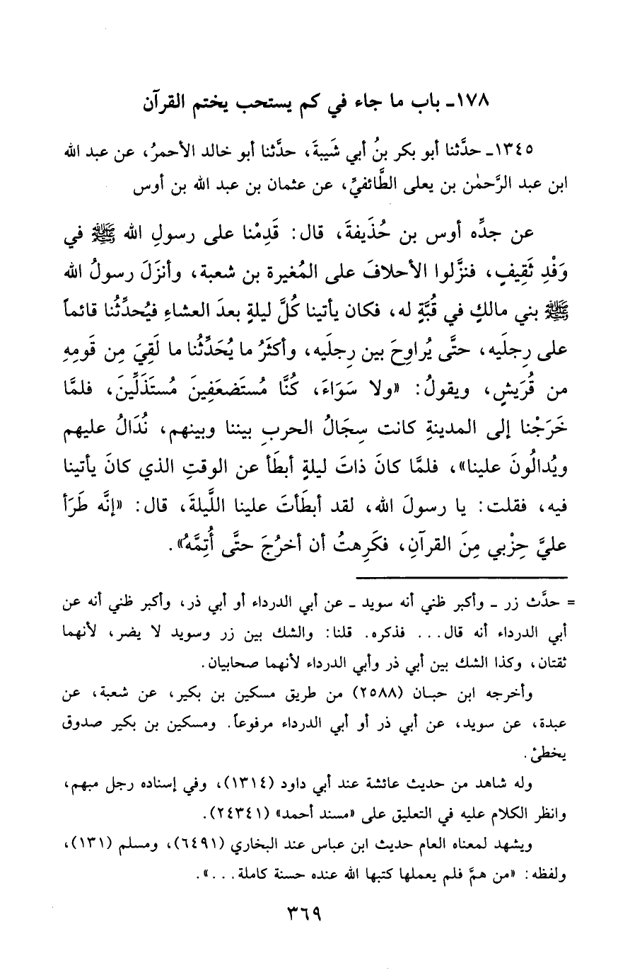 1345- حَدَّثَنَا أَبُو بَكْرِ بْنُ أَبِي شَيْبَةَ ، حَدَّثَنَا أَبُو خَالِدٍ الأَحْمَرُ ، عَنْ عَبْدِ اللهِ بْنِ عَبْدِ الرَّحْمَنِ بْنِ يَعْلَى الطَّائِفِيِّ ، عَنْ عُثْمَانَ بْنِ عَبْدِ اللهِ بْنِ أَوْسٍ ، عَنْ جَدِّهِ أَوْسِ بْنِ حُذَيْفَةَ ، قَالَ : قَدِمْنَا عَلَى رَسُولِ اللهِ صَلَّى الله عَليْهِ وسَلَّمَ فِي وَفْدِ ثَقِيفٍ ، فَنَزَّلُوا الأَحْلاَفَ عَلَى الْمُغِيرَةِ بْنِ شُعْبَةَ ، وَأَنْزَلَ رَسُولُ اللهِ صَلَّى الله عَليْهِ وسَلَّمَ بَنِي مَالِكٍ فِي قُبَّةٍ لَهُ ، فَكَانَ يَأْتِينَا كُلَّ لَيْلَةٍ بَعْدَ الْعِشَاءِ , فَيُحَدِّثُنَا قَائِمًا عَلَى رِجْلَيْهِ ، حَتَّى يُرَاوِحَ بَيْنَ رِجْلَيْهِ , وَأَكْثَرُ مَا يُحَدِّثُنَا مَا لَقِيَ مِنْ قَوْمِهِ مِنْ قُرَيْشٍ , وَيَقُولُ : وَلاَ سَوَاءَ ، كُنَّا مُسْتَضْعَفِينَ مُسْتَذَلِّينَ ، فَلَمَّا خَرَجْنَا إِلَى الْمَدِينَةِ , كَانَتْ سِجَالُ الْحَرْبِ بَيْنَنَا وَبَيْنَهُمْ ، نُدَالُ عَلَيْهِمْ وَيُدَالُونَ عَلَيْنَا ، فَلَمَّا كَانَ ذَاتَ لَيْلَةٍ , أَبْطَأَ عَنِ الْوَقْتِ الَّذِي كَانَ يَأْتِينَا فِيهِ ، فَقُلْتُ : يَا رَسُولَ اللهِ ، لَقَدْ أَبْطَأْتَ عَلَيْنَا اللَّيْلَةَ , قَالَ : إِنَّهُ طَرَأَ عَلَيَّ حِزْبِي مِنَ الْقُرْآنِ , فَكَرِهْتُ أَنْ أَخْرُجَ حَتَّى أُتِمَّهُ.