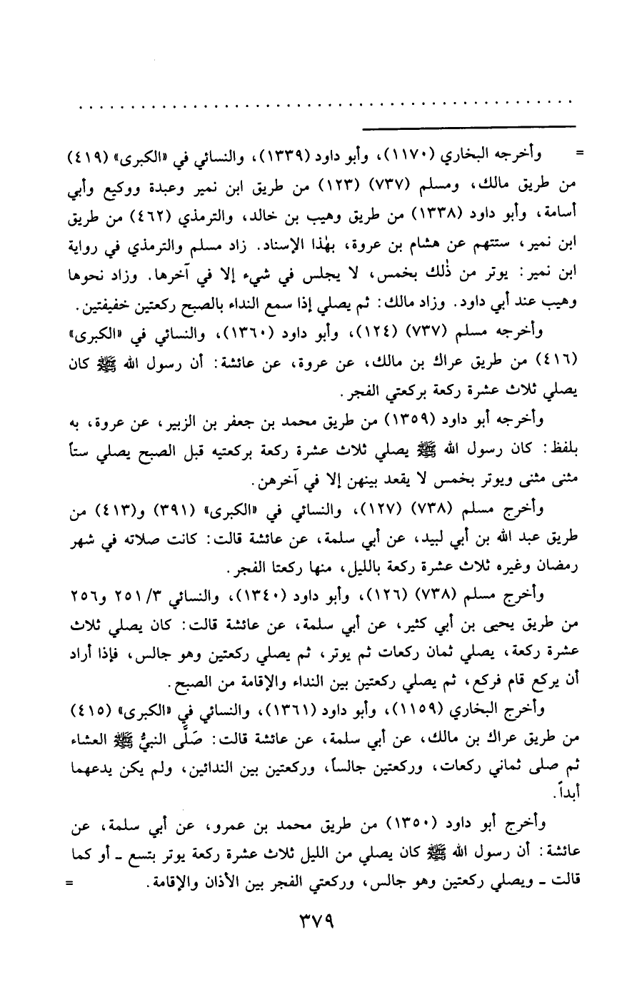 = وأخرجه البخاري (1170)، وأبو داود (1339)، والنسائي في "الكبرى" (419) من طريق مالك، ومسلم (737) (123) من طريق ابن نمير وعبدة ووكيع وأبي أسامة، وأبو داود (1338) من طريق وهيب بن خالد، والترمذي (462) من طريق ابن نمير، ستتهم عن هشام بن عروة، بهذا الإسناد. زاد مسلم والترمذي في رواية ابن نمير: يوتر من ذلك بخمس، لا يجلس في شيء إلا في آخرها. وزاد نحوها وهيب عند أبي داود. وزاد مالك: ثم يصلي إذا سمع النداء بالصبح ركعتين خفيفتين.