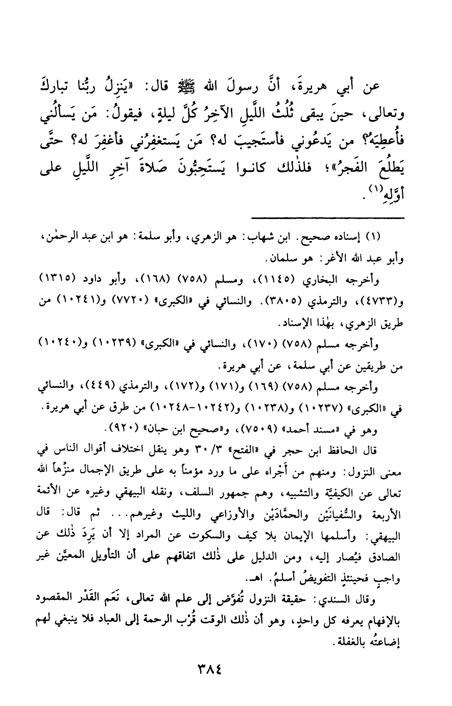 وقال السندي: حقيقة النزول تُفوض إلى علم الله تعالى، نَعَم القَدْر المقصود بالإفهام يعرفه كل واحدٍ، وهو أن ذلك الوقت قُرب الرحمة إلى العباد فلا ينبغي لهم إضاعتُه بالغفلة.