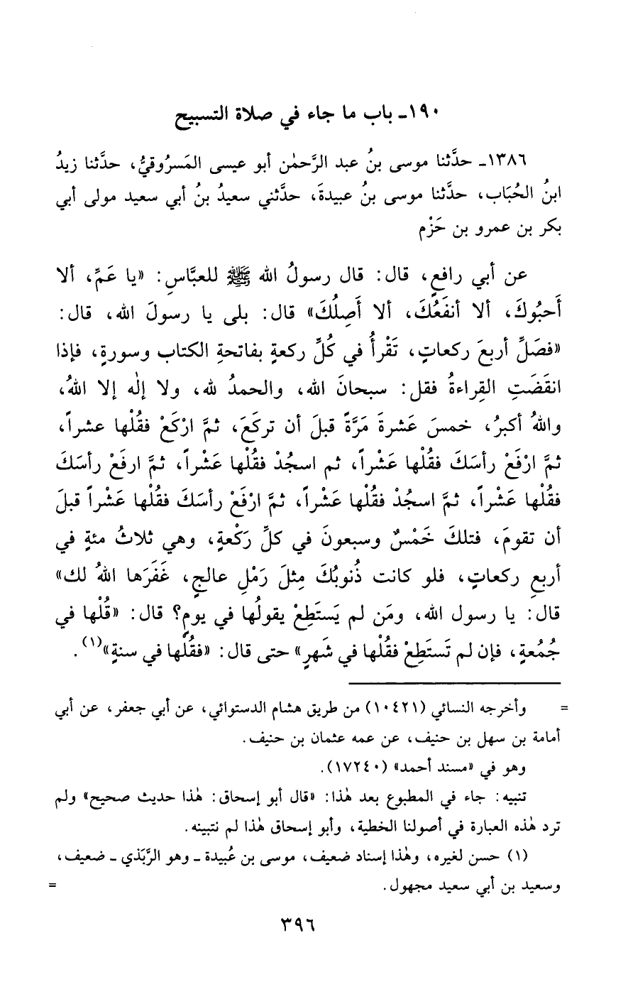1386- حَدَّثَنَا مُوسَى بْنُ عَبْدِ الرَّحْمَنِ أَبُو عِيسَى الْمَسْرُوقِيُّ ، حَدَّثَنَا زَيْدُ بْنُ الْحُبَابِ ، حَدَّثَنَا مُوسَى بْنُ عُبَيْدَةَ , حَدَّثَنِي سَعِيدُ بْنُ أَبِي سَعِيدٍ ، مَوْلَى أَبِي بَكْرِ بْنِ عَمْرِو بْنِ حَزْمٍ ، عَنْ أَبِي رَافِعٍ ، قَالَ : قَالَ رَسُولُ اللهِ صَلَّى الله عَليْهِ وسَلَّمَ لِلْعَبَّاسِ : يَا عَمِّ , أَلاَ أَحْبُوكَ ، أَلاَ أَنْفَعُكَ ، أَلاَ أَصِلُكَ ؟ قَالَ : بَلَى ، يَا رَسُولَ اللهِ ، قَالَ : فَصَلِّ أَرْبَعَ رَكَعَاتٍ , تَقْرَأُ فِي كُلِّ رَكْعَةٍ بِفَاتِحَةِ الْكِتَابِ وَسُورَةٍ ، فَإِذَا انْقَضَتِ الْقِرَاءَةُ , فَقُلْ : سُبْحَانَ اللهِ , وَالْحَمْدُ لِلَّهِ , وَلاَ إِلَهَ إِلاَّ اللَّهُ , وَاللَّهُ أَكْبَرُ , خَمْسَ عَشْرَةَ مَرَّةً , قَبْلَ أَنْ تَرْكَعَ ، ثُمَّ ارْكَعْ فَقُلْهَا عَشْرًا ، ثُمَّ ارْفَعْ رَأْسَكَ فَقُلْهَا عَشْرًا ، ثُمَّ اسْجُدْ فَقُلْهَا عَشْرًا ، ثُمَّ ارْفَعْ رَأْسَكَ فَقُلْهَا عَشْرًا ، ثُمَّ اسْجُدْ فَقُلْهَا عَشْرًا ، ثُمَّ ارْفَعْ رَأْسَكَ فَقُلْهَا عَشْرًا , قَبْلَ أَنْ تَقُومَ ، فَتِلْكَ خَمْسٌ وَسَبْعُونَ فِي كُلِّ رَكْعَةٍ ، وَهِيَ ثَلاَثُ مِئَةٍ فِي أَرْبَعِ رَكَعَاتٍ ، فَلَوْ كَانَتْ ذُنُوبُكَ مِثْلَ رَمْلِ عَالِجٍ غَفَرَهَا اللَّهُ لَكَ , قَالَ : يَا رَسُولَ اللهِ ، وَمَنْ لَمْ يَسْتَطِعْ يَقُولُهَا فِي يَوْمٍ ؟ قَالَ : قُلْهَا فِي جُمُعَةٍ ، فَإِنْ لَمْ تَسْتَطِعْ , فَقُلْهَا فِي شَهْرٍ , حَتَّى قَالَ : فَقُلْهَا فِي سَنَةٍ.