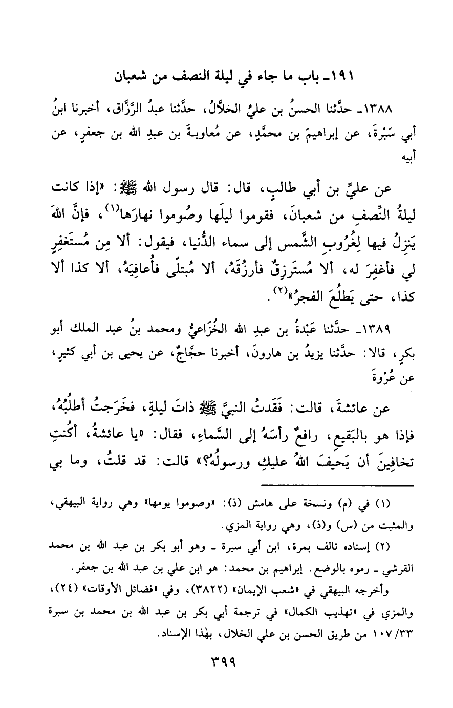 1388- حَدَّثَنَا الْحَسَنُ بْنُ عَلِيٍّ الْخَلاَّلُ ، حَدَّثَنَا عَبْدُ الرَّزَّاقِ ، أَخْبَرَنَا ابْنُ أَبِي سَبْرَةَ ، عَنْ إِبْرَاهِيمَ بْنِ مُحَمَّدٍ ، عَنْ مُعَاوِيَةَ بْنِ عَبْدِ اللهِ بْنِ جَعْفَرٍ ، عَنْ أَبِيهِ ، عَنْ عَلِيِّ بْنِ أَبِي طَالِبٍ ، قَالَ : قَالَ رَسُولُ اللهِ صَلَّى الله عَليْهِ وسَلَّمَ : إِذَا كَانَتْ لَيْلَةُ النِّصْفِ مِنْ شَعْبَانَ ، فَقُومُوا لَيْلَهَا وَصُومُوا نَهَارَهَا ، فَإِنَّ اللَّهَ يَنْزِلُ فِيهَا لِغُرُوبِ الشَّمْسِ إِلَى سَمَاءِ الدُّنْيَا ، فَيَقُولُ : أَلاَ مِنْ مُسْتَغْفِرٍ لِي فَأَغْفِرَ لَهُ , أَلاَ مُسْتَرْزِقٌ فَأَرْزُقَهُ , أَلاَ مُبْتَلًى فَأُعَافِيَهُ , أَلاَ كَذَا أَلاَ كَذَا ، حَتَّى يَطْلُعَ الْفَجْرُ.