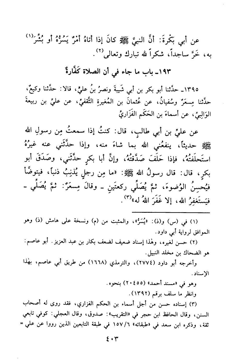 1395- حَدَّثَنَا أَبُو بَكْرِ بْنُ أَبِي شَيْبَةَ ، وَنَصْرُ بْنُ عَلِيٍّ ، قَالاَ : حَدَّثَنَا وَكِيعٌ ، حَدَّثَنَا مِسْعَرٌ ، وَسُفْيَانُ ، عَنْ عُثْمَانَ بْنِ الْمُغِيرَةِ الثَّقَفِيِّ ، عَنْ عَلِيِّ بْنِ رَبِيعَةَ الْوَالِبِيِّ ، عَنْ أَسْمَاءَ بْنِ الْحَكَمِ الْفَزَارِيِّ ، عَنْ عَلِيِّ بْنِ أَبِي طَالِبٍ ، قَالَ : كُنْتُ إِذَا سَمِعْتُ مِنْ رَسُولِ اللهِ صَلَّى الله عَليْهِ وسَلَّمَ حَدِيثًا ، يَنْفَعُنِي اللَّهُ بِمَا شَاءَ مِنْهُ , وَإِذَا حَدَّثَنِي عَنْهُ غَيْرُهُ ، اسْتَحْلَفْتُهُ , فَإِذَا حَلَفَ صَدَّقْتُهُ ، وَإِنَّ أَبَا بَكْرٍ حَدَّثَنِي , وَصَدَقَ أَبُو بَكْرٍ ، قَالَ : قَالَ رَسُولُ اللهِ صَلَّى الله عَليْهِ وسَلَّمَ : مَا مِنْ رَجُلٍ يُذْنِبُ ذَنْبًا , فَيَتَوَضَّأُ فَيُحْسِنُ الْوُضُوءَ , ثُمَّ يُصَلِّي رَكْعَتَيْنِ ، وَقَالَ مِسْعَرٌ : ثُمَّ يُصَلِّي فَيَسْتَغْفِرُ اللَّهَ , إِلاَّ غَفَرَ اللَّهُ لَهُ.