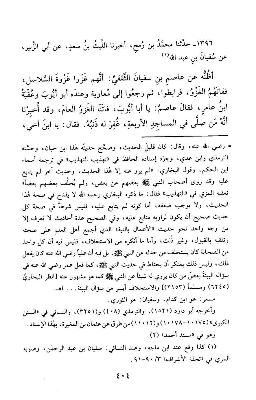 1396- حَدَّثَنَا مُحَمَّدُ بْنُ رُمْحٍ ، أَخْبَرَنَا اللَّيْثُ بْنُ سَعْدٍ ، عَنْ أَبِي الزُّبَيْرِ ، عَنْ سُفْيَانَ بْنِ عَبْدِ اللهِ ، أَظُنُّهُ عَنْ عَاصِمِ بْنِ سُفْيَانَ الثَّقَفِيِّ ، أَنَّهُمْ غَزَوْا غَزْوَةَ السّلاَسِلِ ، فَفَاتَهُمُ الْغَزْوُ ، فَرَابَطُوا ، ثُمَّ رَجَعُوا إِلَى مُعَاوِيَةَ , وَعِنْدَهُ أَبُو أَيُّوبَ , وَعُقْبَةُ بْنُ عَامِرٍ ، فَقَالَ عَاصِمٌ : يَا أَبَا أَيُّوبَ , فَاتَنَا الْغَزْوُ الْعَامَ ، وَقَدْ أُخْبِرْنَا أَنَّهُ مَنْ صَلَّى فِي الْمَسَاجِدِ الأَرْبَعَةِ ، غُفِرَ لَهُ ذَنْبُهُ ، فَقَالَ : يَا ابْنَ أَخِي , أَدُلُّكَ عَلَى أَيْسَرَ مِنْ ذَلِكَ ، إِنِّي سَمِعْتُ رَسُولَ اللهِ صَلَّى الله عَليْهِ وسَلَّمَ يَقُولُ : مَنْ تَوَضَّأَ كَمَا أُمِرَ ، وَصَلَّى كَمَا أُمِرَ ، غُفِرَ لَهُ مَا تَقَدَّمَ مِنْ عَمَلٍ , أَكَذَلِكَ يَا عُقْبَةُ ؟ قَالَ : نَعَمْ.