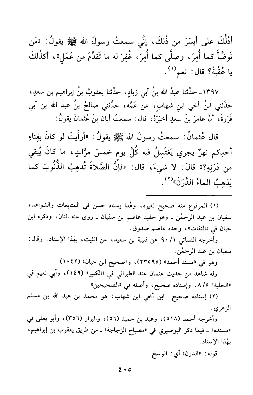 1397- حَدَّثَنَا عَبْدُ اللهِ بْنُ أَبِي زِيَادٍ ، حَدَّثَنَا يَعْقُوبُ بْنُ إِبْرَاهِيمَ بْنِ سَعْدٍ , حَدَّثَنِي ابْنُ أَخِي ابْنِ شِهَابٍ ، عَنْ عَمِّهِ , حَدَّثَنِي صَالِحُ بْنُ عَبْدِ اللهِ بْنِ أَبِي فَرْوَةَ ، أَنَّ عَامِرَ بْنَ سَعْدٍ أَخْبَرَهُ , قَالَ : سَمِعْتُ أَبَانَ بْنَ عُثْمَانَ يَقُولَ : قَالَ عُثْمَانُ : سَمِعْتُ رَسُول اللهِ صَلَّى الله عَليْهِ وسَلَّمَ يَقُولُ : أَرَأَيْتَ لَوْ كَانَ بِفِنَاءِ أَحَدِكُمْ نَهَرٌ يَجْرِي , يَغْتَسِلُ فِيهِ كُلَّ يَوْمٍ خَمْسَ مَرَّاتٍ ، مَا كَانَ يَبْقِي مِنْ دَرَنِهِ ؟ قَالَ : لاَ شَيْءَ ، قَالَ : فَإِنَّ الصَّلاَةَ تُذْهِبُ الذُّنُوبَ كَمَا يُذْهِبُ الْمَاءُ الدَّرَنَ.