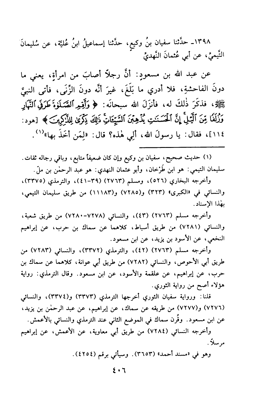 1398- حَدَّثَنَا سُفْيَانُ بْنُ وَكِيعٍ ، حَدَّثَنَا إِسْمَاعِيلُ ابْنُ عُلَيَّةَ ، عَنْ سُلَيْمَانَ التَّيْمِيِّ ، عَنْ أَبِي عُثْمَانَ النَّهْدِيِّ ، عَنْ عَبْدِ اللهِ بْنِ مَسْعُودٍ ، أَنَّ رَجُلاً أَصَابَ مِنَ امْرَأَةٍ ، يَعْنِي مَا دُونَ الْفَاحِشَةِ ، فَلاَ أَدْرِي مَا بَلَغَ ، غَيْرَ أَنَّهُ دُونَ الزِّنَا ، فَأَتَى النَّبِيَّ صَلَّى الله عَليْهِ وسَلَّمَ ، فَذَكَرَ ذَلِكَ لَهُ ، فَأَنْزَلَ اللَّهُ سُبْحَانَهُ : {وَأَقِمِ الصَّلاَةَ طَرَفَيِ النَّهَارِ وَزُلَفًا مِنَ اللَّيْلِ إِنَّ الْحَسَنَاتِ يُذْهِبْنَ السَّيِّئَاتِ ذَلِكَ ذِكْرَى لِلذَّاكِرِينَ} فَقَالَ : يَا رَسُولَ اللهِ ، أَلِي هَذِهِ ؟ قَالَ : لِمَنْ أَخَذَ بِهَا.