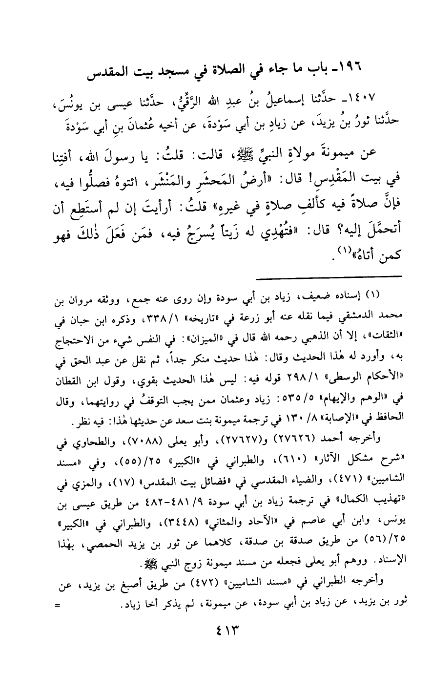 1407- حَدَّثَنَا إِسْمَاعِيلُ بْنُ عَبْدِ اللهِ الرَّقِّيُّ ، حَدَّثَنَا عِيسَى بْنُ يُونُسَ ، حَدَّثَنَا ثَوْرُ بْنُ يَزِيدَ ، عَنْ زِيَادِ بْنِ أَبِي سَوْدَةَ ، عَنْ أَخِيهِ عُثْمَانَ بْنِ أَبِي سَوْدَةَ ، عَنْ مَيْمُونَةَ ، مَوْلاَةِ النَّبِيِّ صَلَّى الله عَليْهِ وسَلَّمَ , قَالَتْ : قُلْتُ : يَا رَسُولَ اللهِ ، أَفْتِنَا فِي بَيْتِ الْمَقْدِسِ , قَالَ : أَرْضُ الْمَحْشَرِ وَالْمَنْشَرِ , ائْتُوهُ فَصَلُّوا فِيهِ ، فَإِنَّ صَلاَةً فِيهِ كَأَلْفِ صَلاَةٍ فِي غَيْرِهِ , قُلْتُ : أَرَأَيْتَ إِنْ لَمْ أَسْتَطِعْ أَنْ أَتَحَمَّلَ إِلَيْهِ ؟ قَالَ : فَتُهْدِي لَهُ زَيْتًا يُسْرَجُ فِيهِ ، فَمَنْ فَعَلَ ذَلِكَ فَهُوَ كَمَنْ أَتَاهُ.