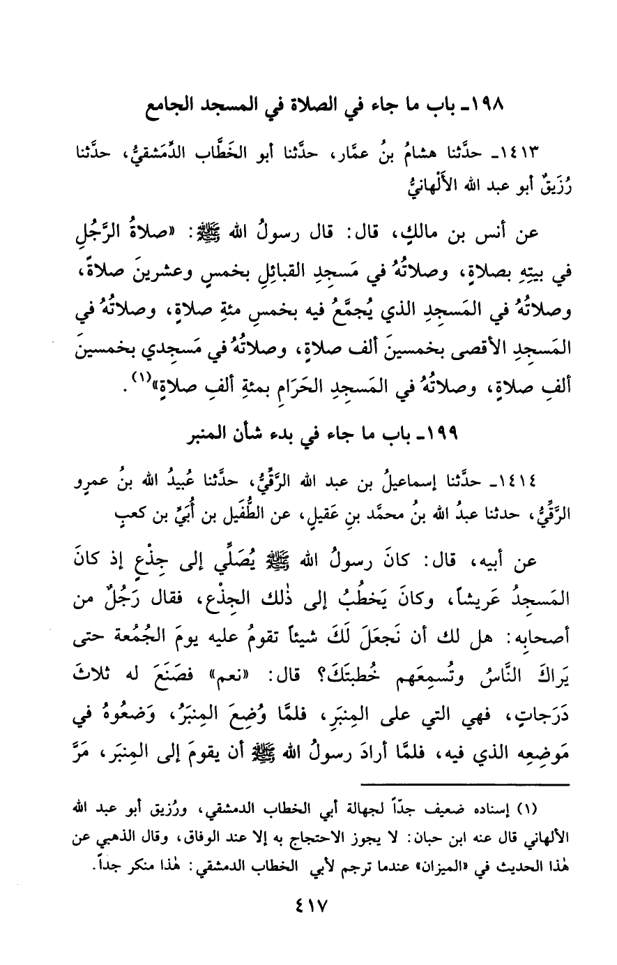1413- حَدَّثَنَا هِشَامُ بْنُ عَمَّارٍ ، حَدَّثَنَا أَبُو الْخَطَّابِ الدِّمَشْقِيُّ ، حَدَّثَنَا رُزَيْقٌ أَبُو عَبْدِ اللهِ الأَلْهَانِيُّ ، عَنْ أَنَسِ بْنِ مَالِكٍ ، قَالَ : قَالَ رَسُولُ اللهِ صَلَّى الله عَليْهِ وسَلَّمَ : صَلاَةُ الرَّجُلِ فِي بَيْتِهِ بِصَلاَةٍ ، وَصَلاَتُهُ فِي مَسْجِدِ الْقَبَائِلِ بِخَمْسٍ وَعِشْرِينَ صَلاَةً ، وَصَلاَتُهُ فِي الْمَسْجِدِ الَّذِي يُجَمَّعُ فِيهِ بِخَمْسِ مِئَةِ صَلاَةٍ ، وَصَلاَتُهُ فِي الْمَسْجِدِ الأَقْصَى بِخَمْسِينَ أَلْفِ صَلاَةٍ ، وَصَلاَتُهُ فِي مَسْجِدِي بِخَمْسِينَ أَلْفِ صَلاَةٍ ، وَصَلاَتُهُ فِي الْمَسْجِدِ الْحَرَامِ بِمِئَةِ أَلْفِ صَلاَةٍ.