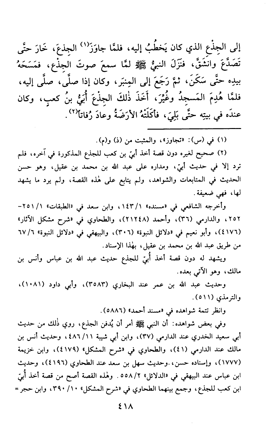 وفي بعض شواهده: أن النبي - صَلَّى اللَّهُ عَلَيْهِ وَسَلَّمَ - أمر أن يُدفن الجذع، روي ذلك من حديث أبي سعيد الخدري عند الدارمي (37)، وابن أبي شيبة 11/ 486، وحديث أنس بن مالك عند الدارمي (41)، والطحاوي في "شرح المشكل" (4179)، وابن خزيمة (1777)، وإسناده حسن، وحديث سهل بن سعد عند الطحاوي (4196)، وحديث ابن عباس عند البيهقي في "الدلائل" 2/ 558. وهذه القصة أصح من قصة أخذ أُبي ابن كعب للجذع، وجمع بينهما الطحاوي في "شرح المشكل" 10/ 390، وابن حجر =