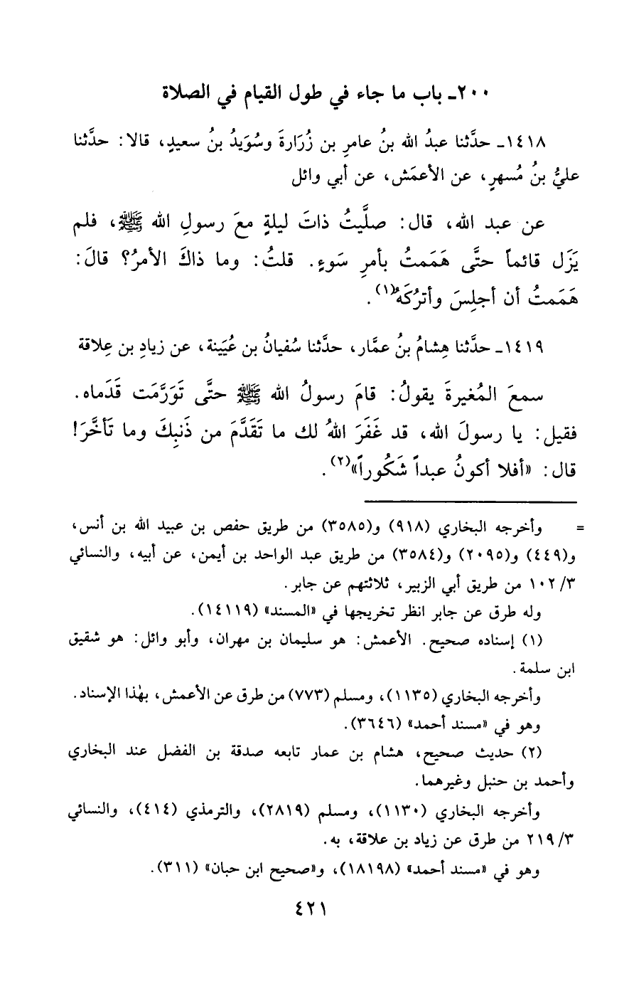 1418- حَدَّثَنَا عَبْدُ اللهِ بْنُ عَامِرِ بْنِ زُرَارَةَ ، وَسُوَيْدُ بْنُ سَعِيدٍ ، قَالاَ : حَدَّثَنَا عَلِيُّ بْنُ مُسْهِرٍ ، عَنِ الأَعْمَشِ ، عَنْ أَبِي وَائِلٍ ، عَنْ عَبْدِ اللهِ ، قَالَ : صَلَّيْتُ ذَاتَ لَيْلَةٍ مَعَ رَسُولِ اللهِ صَلَّى الله عَليْهِ وسَلَّمَ , فَلَمْ يَزَلْ قَائِمًا حَتَّى هَمَمْتُ بِأَمْرِ سَوْءٍ ، قُلْتُ : وَمَا ذَاكَ الأَمْرُ ؟ قَالَ : هَمَمْتُ أَنْ أَجْلِسَ وَأَتْرُكَهُ.