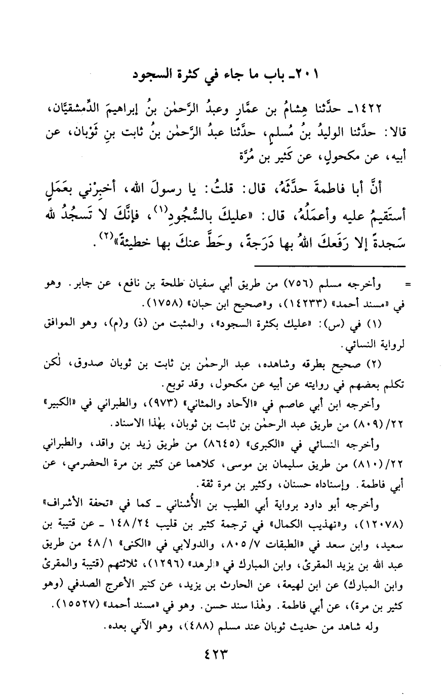 1422- حَدَّثَنَا هِشَامُ بْنُ عَمَّارٍ ، وَعَبْدُ الرَّحْمَنِ بْنُ إِبْرَاهِيمَ الدِّمَشْقِيَّانِ ، قَالاَ : حَدَّثَنَا الْوَلِيدُ بْنُ مُسْلِمٍ ، حَدَّثَنَا عَبْدُ الرَّحْمَنِ بْنُ ثَابِتِ بْنِ ثَوْبَانَ ، عَنْ أَبِيهِ ، عَنْ مَكْحُولٍ ، عَنْ كَثِيرِ بْنِ مُرَّةَ ، أَنَّ أَبَا فَاطِمَةَ حَدَّثَهُ قَالَ : قُلْتُ : يَا رَسُولَ اللهِ ، أَخْبِرْنِي بِعَمَلٍ أَسْتَقِيمُ عَلَيْهِ وَأَعْمَلُهُ ، قَالَ : عَلَيْكَ بِالسُّجُودِ ؛ فَإِنَّكَ لاَ تَسْجُدُ لِلَّهِ سَجْدَةً , إِلاَّ رَفَعَكَ اللَّهُ بِهَا دَرَجَةً ، وَحَطَّ عَنْكَ بِهَا خَطِيئَةً.