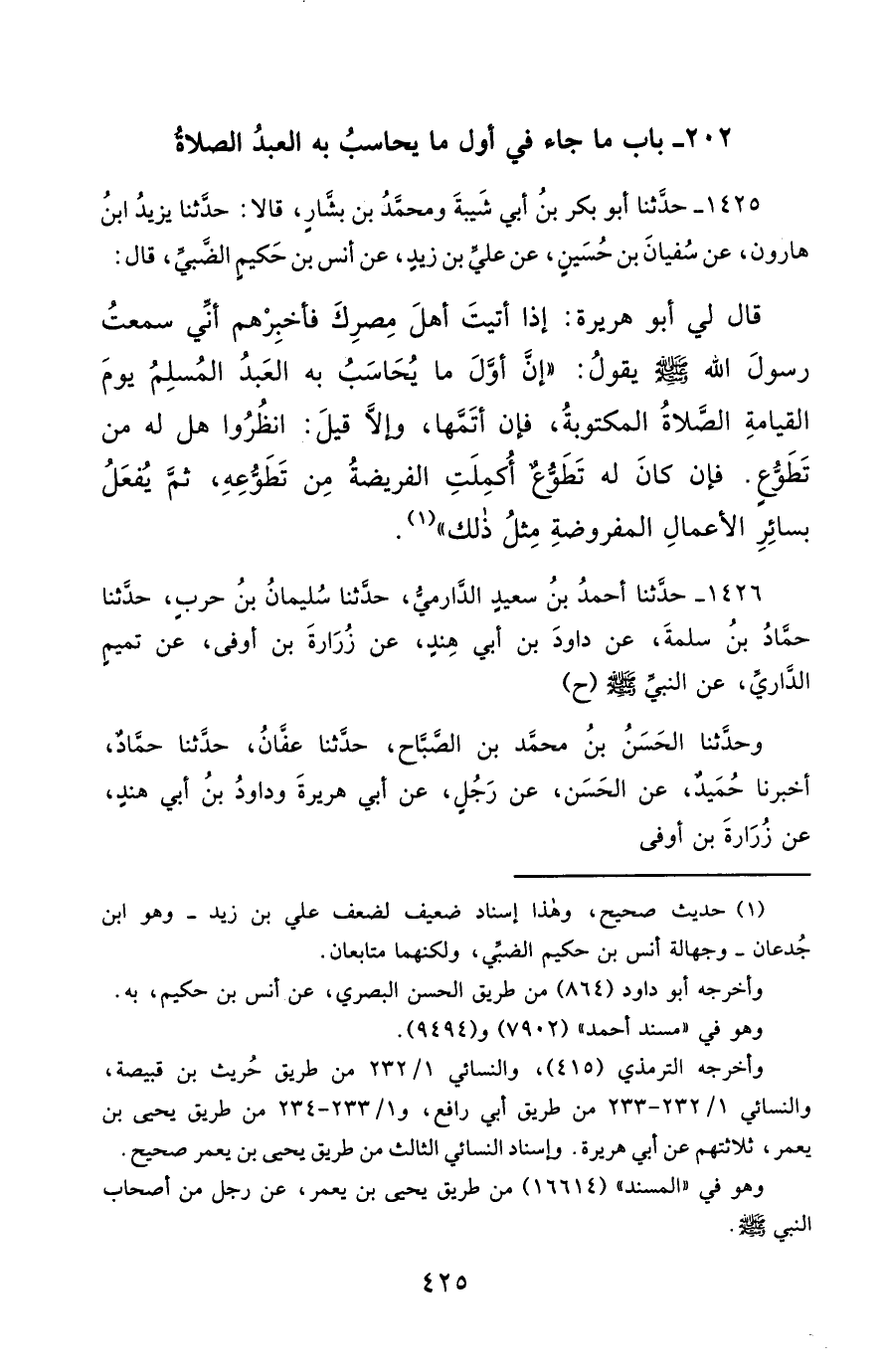 1425- حَدَّثَنَا أَبُو بَكْرِ بْنُ أَبِي شَيْبَةَ ، وَمُحَمَّدُ بْنُ بَشَّارٍ ، قَالاَ : حَدَّثَنَا يَزِيدُ بْنُ هَارُونَ ، عَنْ سُفْيَانَ بْنِ حُسَيْنٍ ، عَنْ عَلِيِّ بْنِ زَيْدٍ ، عَنْ أَنَسِ بْنِ حَكِيمٍ الضَّبِّيِّ ، قَالَ : قَالَ لِي أَبُو هُرَيْرَةَ : إِذَا أَتَيْتَ أَهْلَ مِصْرِكَ , فَأَخْبِرْهُمْ أَنِّي سَمِعْتُ رَسُول اللهِ صَلَّى الله عَليْهِ وسَلَّمَ يَقُولُ : إِنَّ أَوَّلَ مَا يُحَاسَبُ بِهِ الْعَبْدُ الْمُسْلِمُ يَوْمَ الْقِيَامَةِ ، الصَّلاَةُ الْمَكْتُوبَةُ ، فَإِنْ أَتَمَّهَا ، وَإِلاَّ قِيلَ : انْظُرُوا هَلْ لَهُ مِنْ تَطَوُّعٍ ؟ فَإِنْ كَانَ لَهُ تَطَوُّعٌ , أُكْمِلَتِ الْفَرِيضَةُ مِنْ تَطَوُّعِهِ ، ثُمَّ يُفْعَلُ بِسَائِرِ الأَعْمَالِ الْمَفْرُوضَةِ مِثْلُ ذَلِكَ.