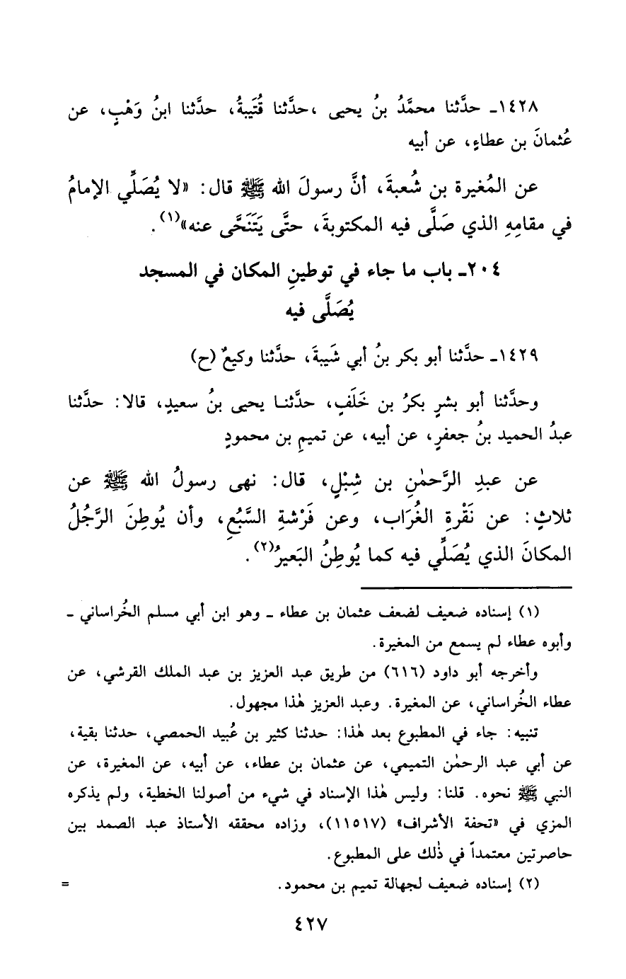 (1) قال محققه : "تنبيه : جاءفي المطبوع بعد هذا : 1428م- حَدَّثَنَا كَثِيرُ بْنُ عُبَيْدٍ الْحِمْصِيُّ ، حَدَّثَنَا بَقِيَّةُ ، عَنْ أَبِي عَبْدِ الرَّحْمَنِ التَّمِيمِيِّ ، عَنْ عُثْمَانَ بْنِ عَطَاءٍ ، عَنْ أَبِيهِ ، عَنِ الْمُغِيرَةِ ، عَنِ النَّبِيِّ صَلَّى الله عَليْهِ وسَلَّمَ , نَحْوَهُ".