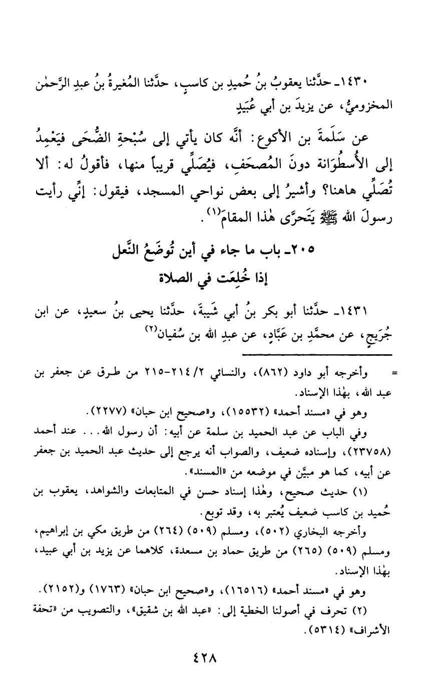 1430- حَدَّثَنَا يَعْقُوبُ بْنُ حُمَيْدِ بْنِ كَاسِبٍ ، حَدَّثَنَا الْمُغِيرَةُ بْنُ عَبْدِ الرَّحْمَنِ الْمَخْزُومِيُّ ، عَنْ يَزِيدَ بْنِ أَبِي عُبَيْدٍ ، عَنْ سَلَمَةَ بْنِ الأَكْوَعِ ، أَنَّهُ كَانَ يَأْتِي إِلَى سُبْحَةِ الضُّحَى , فَيَعْمِدُ إِلَى الأُسْطُوَانَةِ ، دُونَ الْمُصْحَفِ ، فَيُصَلِّي قَرِيبًا مِنْهَا ، فَأَقُولُ لَهُ : أَلاَ تُصَلِّي هَاهُنَا ؟ وَأُشِيرُ إِلَى بَعْضِ نَوَاحِي الْمَسْجِدِ ، فَيَقُولُ : إِنِّي رَأَيْتُ رَسُولَ اللهِ صَلَّى الله عَليْهِ وسَلَّمَ يَتَحَرَّى هَذَا الْمُقَامَ.