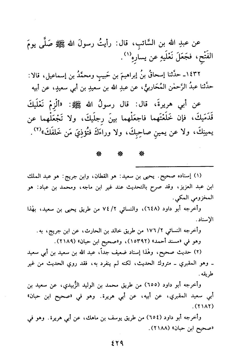 1432- حَدَّثَنَا إِسْحَاقُ بْنُ إِبْرَاهِيمَ بْنِ حَبِيبٍ ، وَمُحَمَّدُ بْنُ إِسْمَاعِيلَ ، قَالاَ : حَدَّثَنَا عَبْدُ الرَّحْمَنِ الْمُحَارِبِيُّ ، عَنْ عَبْدِ اللهِ بْنِ سَعِيدِ بْنِ أَبِي سَعِيدٍ ، عَنْ أَبِيهِ ، عَنْ أَبِي هُرَيْرَةَ ، قَالَ : قَالَ رَسُولُ اللهِ صَلَّى الله عَليْهِ وسَلَّمَ : أَلْزِمْ نَعْلَيْكَ قَدَمَيْكَ ، فَإِنْ خَلَعْتَهُمَا , فَاجْعَلْهُمَا بَيْنَ رِجْلَيْكَ ، وَلاَ تَجْعَلْهُمَا عَنْ يَمِينِكَ ، وَلاَ عَنْ يَمِينِ صَاحِبِكَ ، وَلاَ وَرَاءَكَ ، فَتُؤْذِيَ مَنْ خَلْفَكَ.
