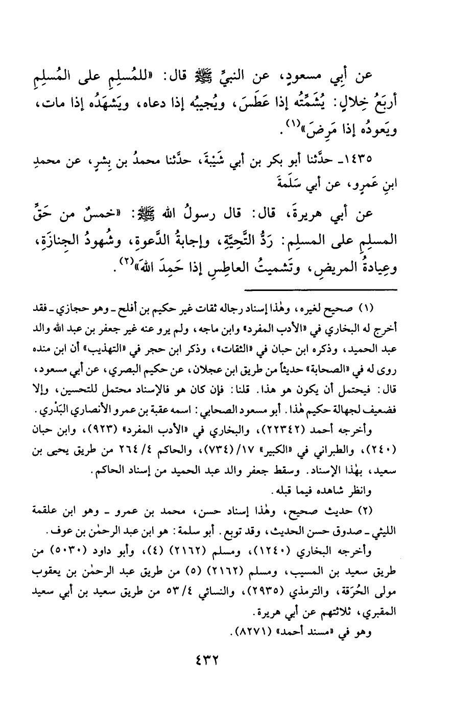 1435- حَدَّثَنَا أَبُو بَكْرِ بْنُ أَبِي شَيْبَةَ ، حَدَّثَنَا مُحَمَّدُ بْنُ بِشْرٍ ، عَنْ مُحَمَّدِ بْنِ عَمْرٍو ، عَنْ أَبِي سَلَمَةَ ، عَنْ أَبِي هُرَيْرَةَ ، قَالَ : قَالَ رَسُولُ اللهِ صَلَّى الله عَليْهِ وسَلَّمَ : خَمْسٌ مِنْ حَقِّ الْمُسْلِمِ عَلَى الْمُسْلِمِ : رَدُّ التَّحِيَّةِ ، وَإِجَابَةُ الدَّعْوَةِ ، وَشُهُودُ الْجِنَازَةِ ، وَعِيَادَةُ الْمَرِيضِ ، وَتَشْمِيتُ الْعَاطِسِ إِذَا حَمِدَ اللَّهَ.