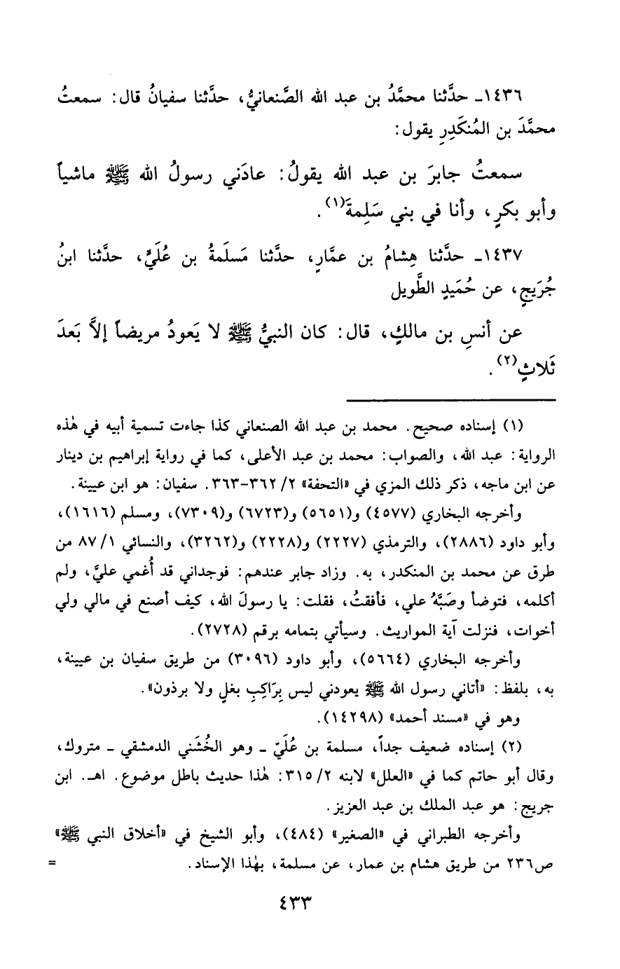 1436- حَدَّثَنَا مُحَمَّدُ بْنُ عَبْدِ اللهِ الصَّنْعَانِيُّ ، حَدَّثَنَا سُفْيَانُ ، قَالَ : سَمِعْتُ مُحَمَّدَ بْنَ الْمُنْكَدِرِ يَقُولُ : سَمِعْتُ جَابِرَ بْنَ عَبْدِ اللهِ يَقُولُ : عَادَنِي رَسُولُ اللهِ صَلَّى الله عَليْهِ وسَلَّمَ مَاشِيًا وَأَبُو بَكْرٍ ، وَأَنَا فِي بَنِي سَلِمَةَ.