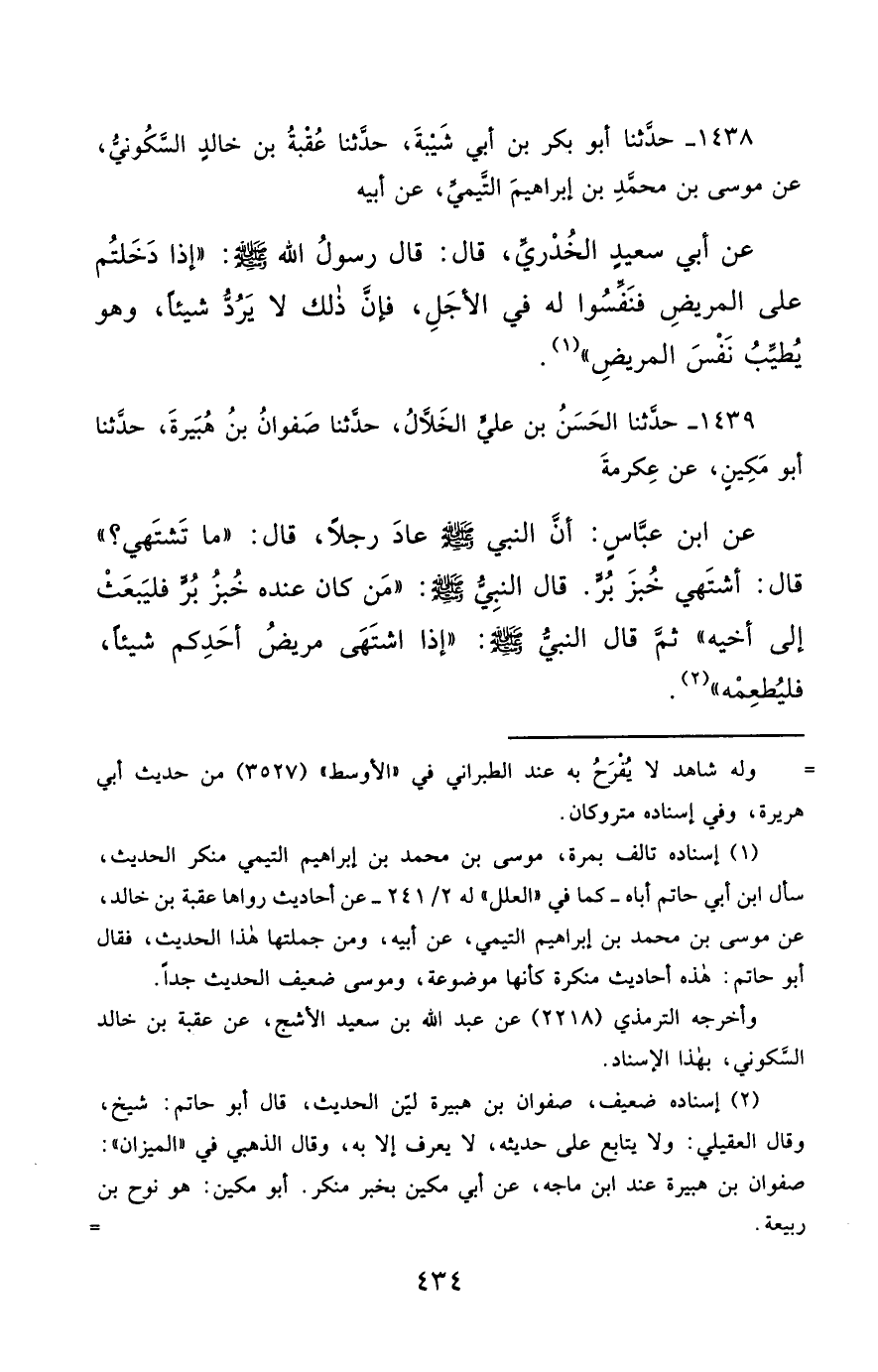1438- حَدَّثَنَا أَبُو بَكْرِ بْنُ أَبِي شَيْبَةَ ، حَدَّثَنَا عُقْبَةُ بْنُ خَالِدٍ السَّكُونِيُّ ، عَنْ مُوسَى بْنِ مُحَمَّدِ بْنِ إِبْرَاهِيمَ التَّيْمِيِّ ، عَنْ أَبِيهِ ، عَنْ أَبِي سَعِيدٍ الْخُدْرِيِّ ، قَالَ : قَالَ رَسُولُ اللهِ صَلَّى الله عَليْهِ وسَلَّمَ : إِذَا دَخَلْتُمْ عَلَى الْمَرِيضِ ، فَنَفِّسُوا لَهُ فِي الأَجَلِ ، فَإِنَّ ذَلِكَ لاَ يَرُدُّ شَيْئًا ، وَهُوَ يُطَيِّبُ نَفْسَ الْمَرِيضِ.
