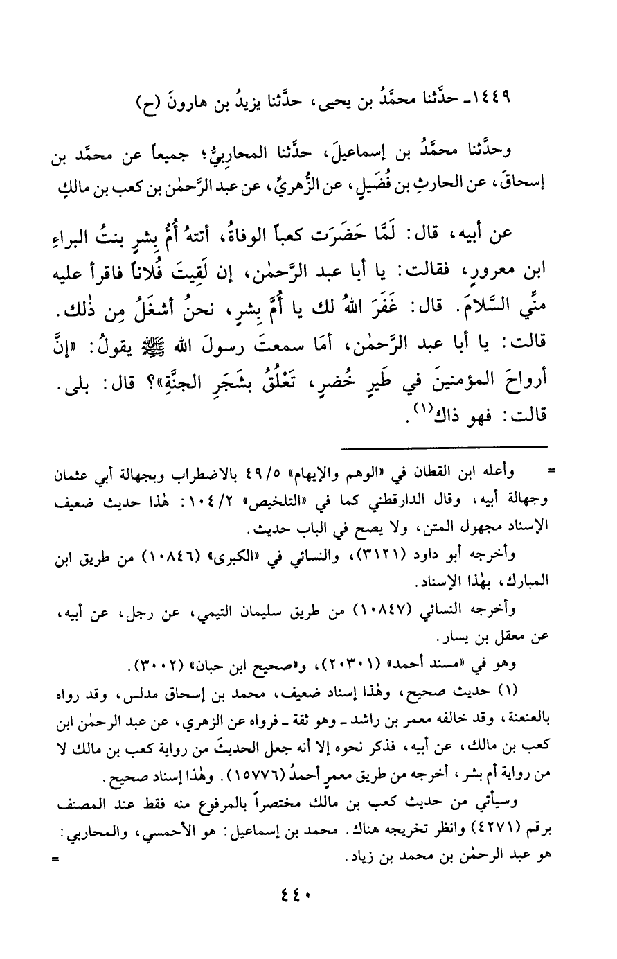 1449- حَدَّثَنَا مُحَمَّدُ بْنُ يَحْيَى ، حَدَّثَنَا يَزِيدُ بْنُ هَارُونَ (ح) وحَدَّثَنَا مُحَمَّدُ بْنُ إِسْمَاعِيلَ ، حَدَّثَنَا الْمُحَارِبِيُّ ؛ جَمِيعًا عَنْ مُحَمَّدِ بْنِ إِسْحَاقَ ، عَنِ الْحَارِثِ بْنِ فُضَيْلٍ ، عَنِ الزُّهْرِيِّ ، عَنْ عَبْدِ الرَّحْمَنِ بْنِ كَعْبِ بْنِ مَالِكٍ ، عَنْ أَبِيهِ ، قَالَ : لَمَّا حَضَرَتْ كَعْبًا الْوَفَاةُ , أَتَتْهُ أُمُّ بِشْرٍ بِنْتُ الْبَرَاءِ بْنِ مَعْرُورٍ ، فَقَالَتْ : يَا أَبَا عَبْدِ الرَّحْمَنِ , إِنْ لَقِيتَ فُلاَنًا ، فَاقْرَأْ عَلَيْهِ مِنِّي السَّلاَمَ ، قَالَ : غَفَرَ اللَّهُ لَكِ يَا أُمَّ بِشْرٍ , نَحْنُ أَشْغَلُ مِنْ ذَلِكَ ، قَالَتْ : يَا أَبَا عَبْدِ الرَّحْمَنِ , أَمَا سَمِعْتَ رَسُولَ اللهِ صَلَّى الله عَليْهِ وسَلَّمَ يَقُولُ : إِنَّ أَرْوَاحَ الْمُؤْمِنِينَ فِي طَيْرٍ خُضْرٍ ، تَعْلُقُ بِشَجَرِ الْجَنَّةِ ؟ قَالَ : بَلَى ، قَالَتْ : فَهُوَ ذَاكَ.