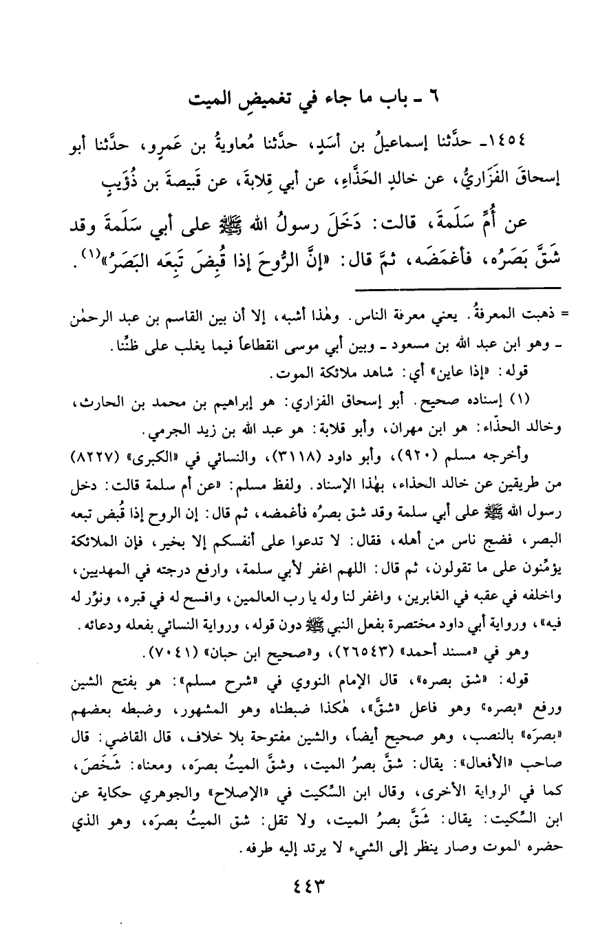 1454- حَدَّثَنَا إِسْمَاعِيلُ بْنُ أَسَدٍ ، حَدَّثَنَا مُعَاوِيَةُ بْنُ عَمْرٍو ، حَدَّثَنَا أَبُو إِسْحَاقَ الْفَزَارِيُّ ، عَنْ خَالِدٍ الْحَذَّاءِ ، عَنْ أَبِي قِلاَبَةَ ، عَنْ قَبِيصَةَ بْنِ ذُؤَيْبٍ ، عَنْ أُمِّ سَلَمَةَ ، قَالَتْ : دَخَلَ رَسُولُ اللهِ صَلَّى الله عَليْهِ وسَلَّمَ عَلَى أَبِي سَلَمَةَ , وَقَدْ شَقَّ بَصَرُهُ , فَأَغْمَضَهُ ، ثُمَّ قَالَ : إِنَّ الرُّوحَ إِذَا قُبِضَ , تَبِعَهُ الْبَصَرُ.