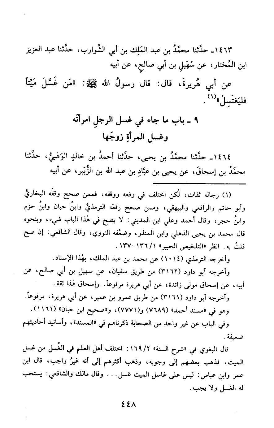 1463- حَدَّثَنَا مُحَمَّدُ بْنُ عَبْدِ الْمَلِكِ بْنِ أَبِي الشَّوَارِبِ ، حَدَّثَنَا عَبْدُ الْعَزِيزِ بْنُ الْمُخْتَارِ ، عَنْ سُهَيْلِ بْنِ أَبِي صَالِحٍ ، عَنْ أَبِيهِ ، عَنْ أَبِي هُرَيْرَةَ ، قَالَ : قَالَ رَسُولُ اللهِ صَلَّى الله عَليْهِ وسَلَّمَ : مَنْ غَسَّلَ مَيِّتًا ، فَلْيَغْتَسِلْ.