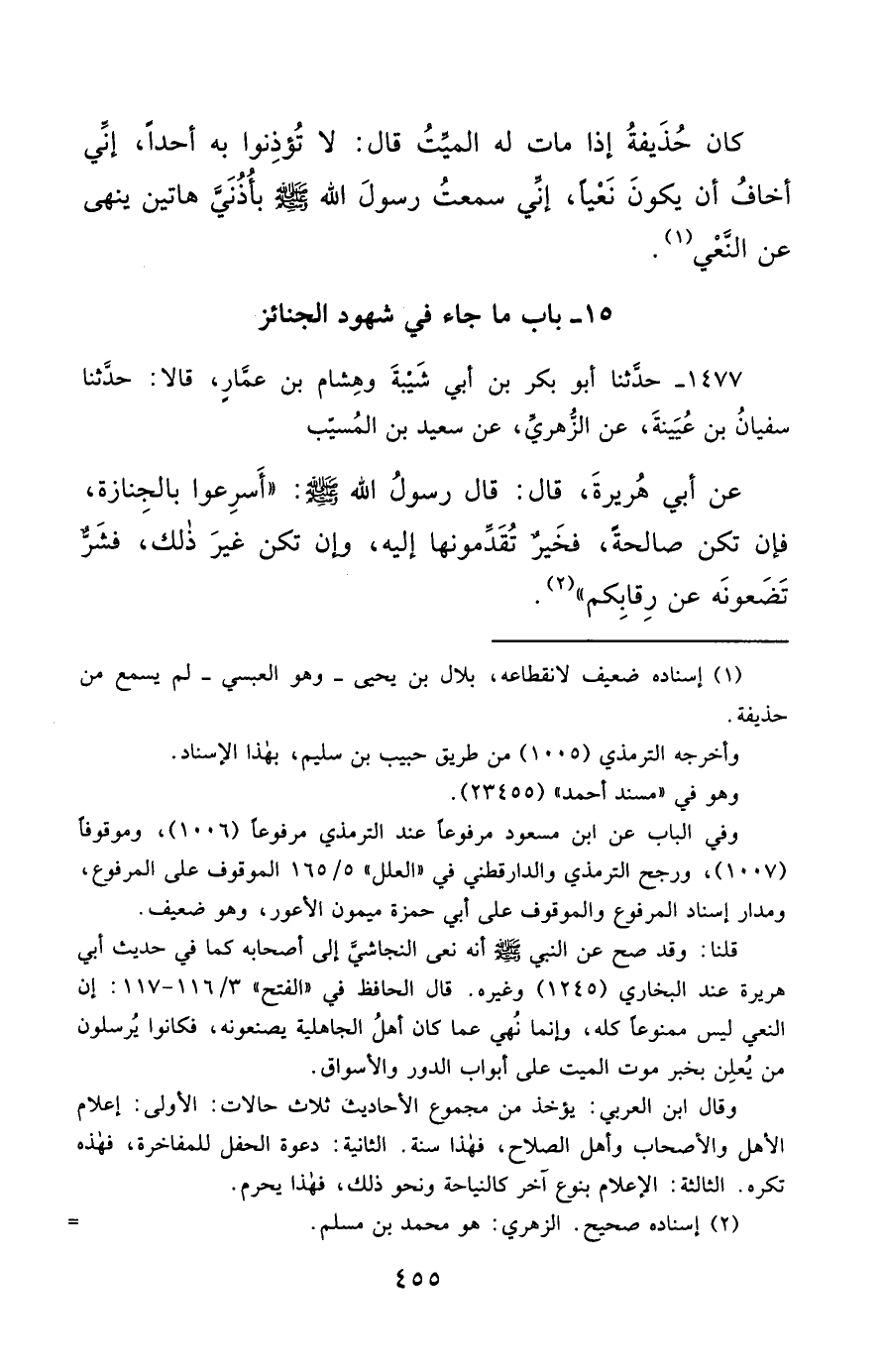 1477- حَدَّثَنَا أَبُو بَكْرِ بْنُ أَبِي شَيْبَةَ ، وَهِشَامُ بْنُ عَمَّارٍ ، قَالاَ : حَدَّثَنَا سُفْيَانُ بْنُ عُيَيْنَةَ ، عَنِ الزُّهْرِيِّ ، عَنْ سَعِيدِ بْنِ الْمُسَيَّبِ ، عَنْ أَبِي هُرَيْرَةَ ، قَالَ : قَالَ رَسُولُ اللهِ صَلَّى الله عَليْهِ وسَلَّمَ : أَسْرِعُوا بِالْجِنَازَةِ ، فَإِنْ تَكُنْ صَالِحَةً , فَخَيْرٌ تُقَدِّمُونَهَا إِلَيْهِ ، وَإِنْ تَكُنْ غَيْرَ ذَلِكَ , فَشَرٌّ تَضَعُونَهُ عَنْ رِقَابِكُمْ.