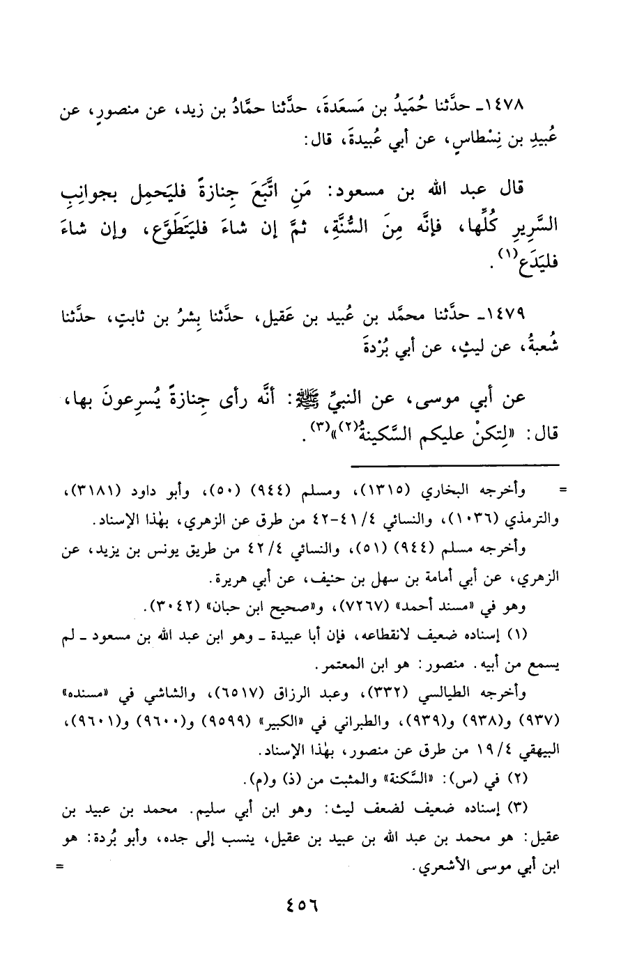 1479- حَدَّثَنَا مُحَمَّدُ بْنُ عُبَيْدِ بْنِ عَقِيلٍ ، حَدَّثَنَا بِشْرُ بْنُ ثَابِتٍ ، حَدَّثَنَا شُعْبَةُ ، عَنْ لَيْثٍ ، عَنْ أَبِي بُرْدَةَ ، عَنْ أَبِي مُوسَى ، عَنِ النَّبِيِّ صَلَّى الله عَليْهِ وسَلَّمَ ، أَنَّهُ رَأَى جِنَازَةً يُسْرِعُونَ بِهَا ، قَالَ : لِتَكُنْ عَلَيْكُمُ السَّكِينَةُ.