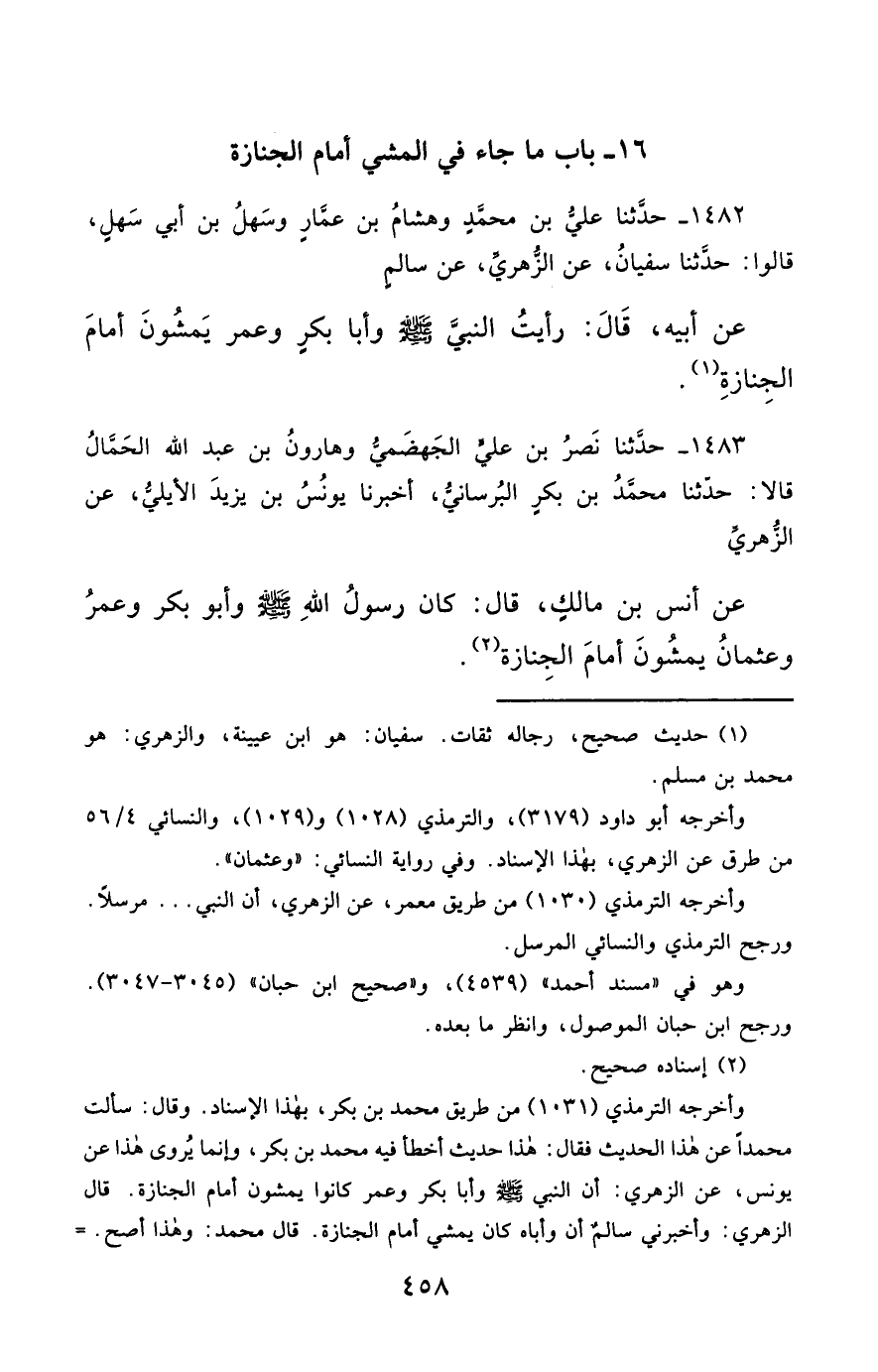 1483- حَدَّثَنَا نَصْرُ بْنُ عَلِيٍّ الْجَهْضَمِيُّ ، وَهَارُونُ بْنُ عَبْدِ اللهِ الْحَمَّالُ ، قَالاَ : حَدَّثَنَا مُحَمَّدُ بْنُ بَكْرٍ الْبُرْسَانِيُّ ، أَخْبَرَنَا يُونُسُ بْنُ يَزِيدَ الأَيْلِيُّ ، عَنِ الزُّهْرِيِّ ، عَنْ أَنَسِ بْنِ مَالِكٍ ، قَالَ : كَانَ رَسُولُ اللهِ صَلَّى الله عَليْهِ وسَلَّمَ , وَأَبُو بَكْرٍ ، وَعُمَرُ ، وَعُثْمَانُ , يَمْشُونَ أَمَامَ الْجِنَازَةِ.