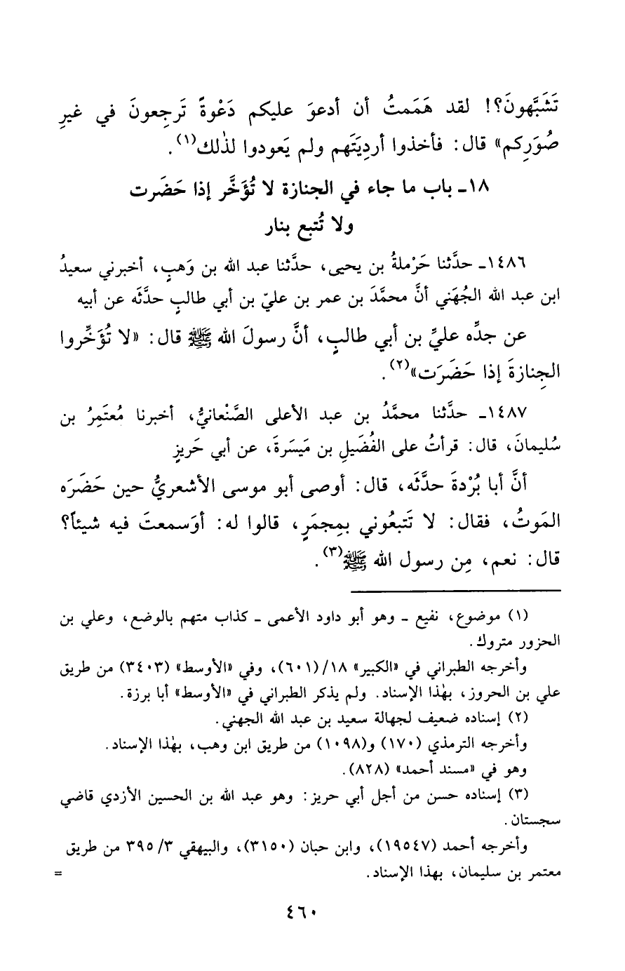 1487- حَدَّثَنَا مُحَمَّدُ بْنُ عَبْدِ الأَعْلَى الصَّنْعَانِيُّ ، أَخْبَرَنَا مُعْتَمِرُ بْنُ سُلَيْمَانَ ، قَالَ : قَرَأْتُ عَلَى الْفُضَيْلِ بْنِ مَيْسَرَةَ ، عَنْ أَبِي حَرِيزٍ ، أَنَّ أَبَا بُرْدَةَ حَدَّثَهُ قَالَ : أَوْصَى أَبُو مُوسَى الأَشْعَرِيُّ حِينَ حَضَرَهُ الْمَوْتُ ، فَقَالَ : لاَ تَتْبَعُونِي بِمِجْمَرٍ ، قَالُوا لَهُ : أَوَسَمِعْتَ فِيهِ شَيْئًا ؟ قَالَ : نَعَمْ ، مِنْ رَسُولِ اللهِ صَلَّى الله عَليْهِ وسَلَّمَ.