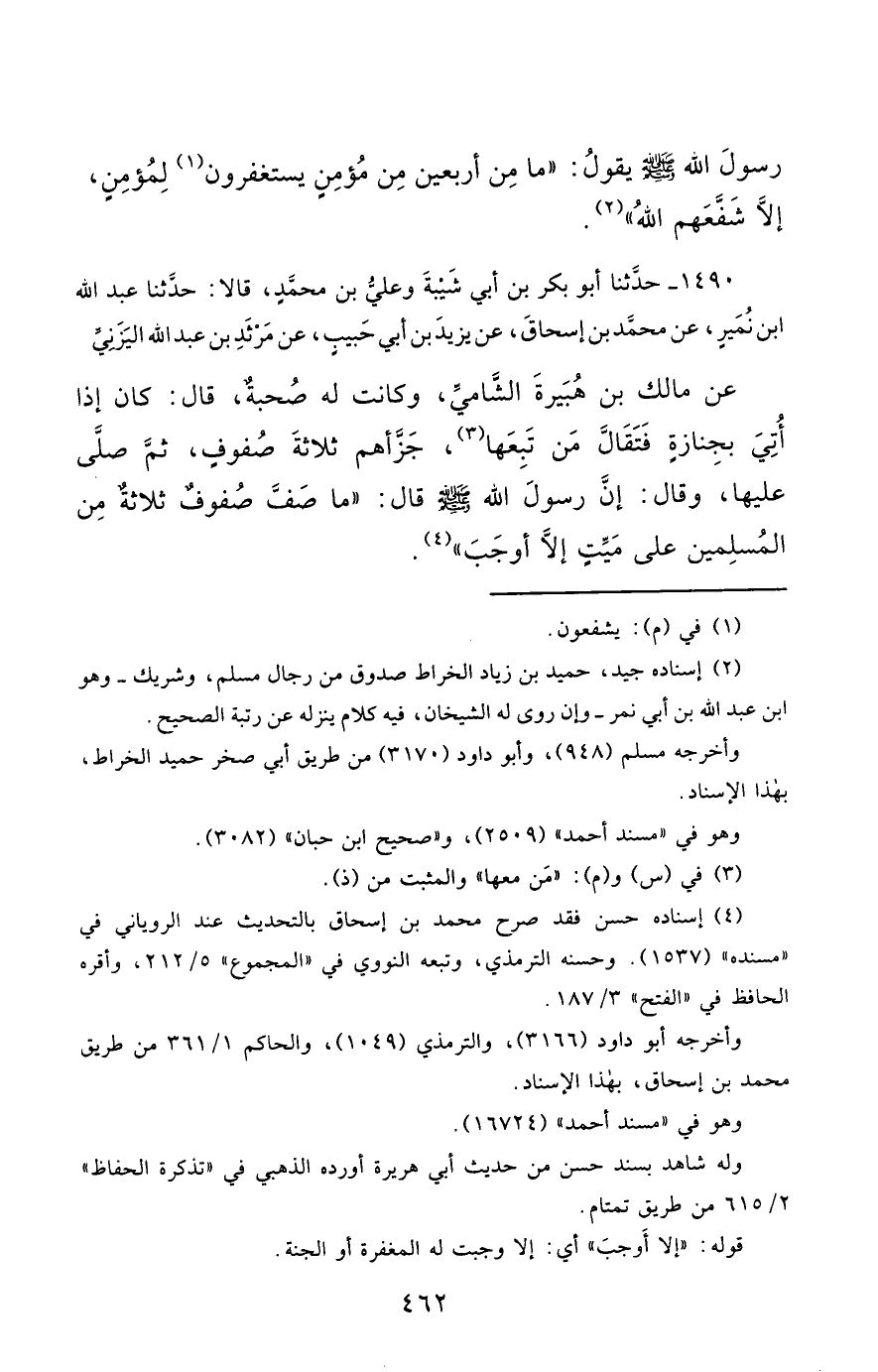 1490- حَدَّثَنَا أَبُو بَكْرِ بْنُ أَبِي شَيْبَةَ ، وَعَلِيُّ بْنُ مُحَمَّدٍ ، قَالاَ : حَدَّثَنَا عَبْدُ اللهِ بْنُ نُمَيْرٍ ، عَنْ مُحَمَّدِ بْنِ إِسْحَاقَ ، عَنْ يَزِيدَ بْنِ أَبِي حَبِيبٍ ، عَنْ مَرْثَدِ بْنِ عَبْدِ اللهِ الْيَزَنِيِّ ، عَنْ مَالِكِ بْنِ هُبَيْرَةَ الشَّامِيِّ ، وَكَانَتْ لَهُ صُحْبَةٌ ، قَالَ : كَانَ إِذَا أُتِيَ بِجِنَازَةٍ ، فَتَقَالَّ مَنْ تَبِعَهَا ، جَزَّأَهُمْ ثَلاَثَةَ صُفُوفٍ ، ثُمَّ صَلَّى عَلَيْهَا ، وَقَالَ : إِنَّ رَسُولَ اللهِ صَلَّى الله عَليْهِ وسَلَّمَ قَالَ : مَا صَفَّ صُفُوفٌ ثَلاَثَةٌ مِنَ الْمُسْلِمِينَ عَلَى مَيِّتٍ , إِلاَّ أَوْجَبَ.