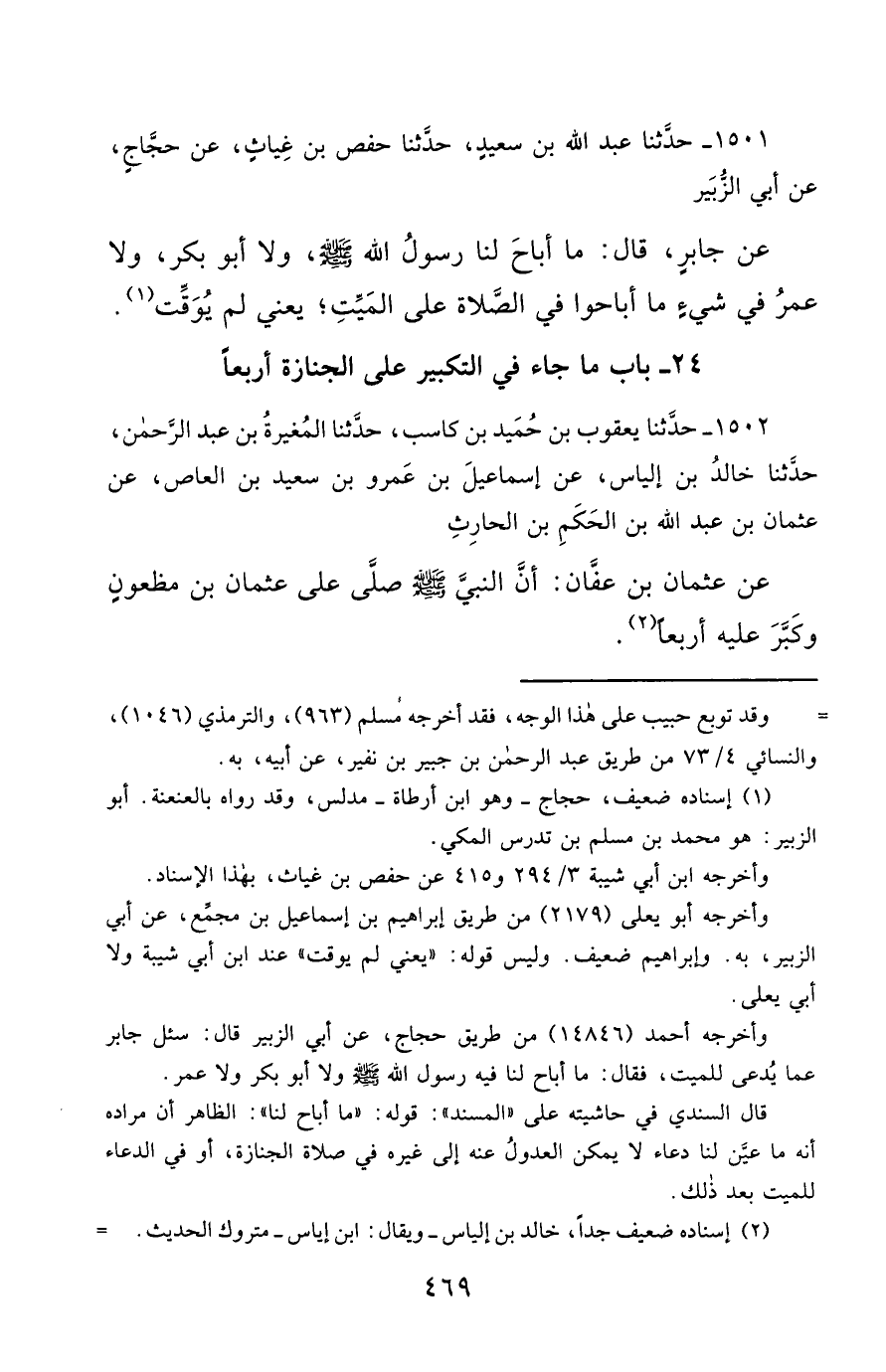 1501- حَدَّثَنَا عَبْدُ اللهِ بْنُ سَعِيدٍ ، حَدَّثَنَا حَفْصُ بْنُ غِيَاثٍ ، عَنْ حَجَّاجٍ ، عَنْ أَبِي الزُّبَيْرِ ، عَنْ جَابِرٍ ، قَالَ : مَا أَبَاحَ لَنَا رَسُولُ اللهِ صَلَّى الله عَليْهِ وسَلَّمَ ، وَلاَ أَبُو بَكْرٍ , وَلاَ عُمَرُ فِي شَيْءٍ ، مَا أَبَاحُوا فِي الصَّلاَةِ عَلَى الْمَيِّتِ , يَعْنِي لَمْ يُوَقِّتْ.