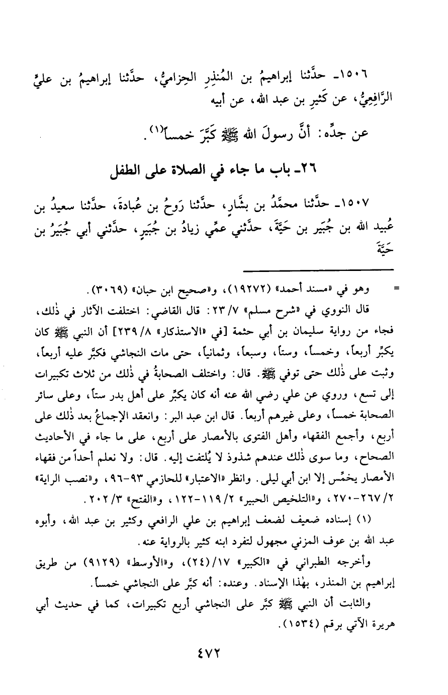 1506- حَدَّثَنَا إِبْرَاهِيمُ بْنُ الْمُنْذِرِ الْحِزَامِيُّ ، حَدَّثَنَا إِبْرَاهِيمُ بْنُ عَلِيٍّ الرَّافِعِيُّ ، عَنْ كَثِيرِ بْنِ عَبْدِ اللهِ ، عَنْ أَبِيهِ ، عَنْ جَدِّهِ ، أَنَّ رَسُولَ اللهِ صَلَّى الله عَليْهِ وسَلَّمَ كَبَّرَ خَمْسًا.