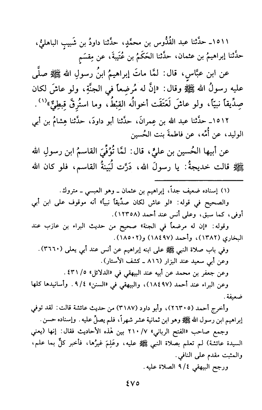 1511- حَدَّثَنَا عَبْدُ الْقُدُّوسِ بْنُ مُحَمَّدٍ ، حَدَّثَنَا دَاوُدُ بْنُ شَبِيبٍ الْبَاهِلِيُّ ، حَدَّثَنَا إِبْرَاهِيمُ بْنُ عُثْمَانَ ، حَدَّثَنَا الْحَكَمُ بْنُ عُتَيْبَةَ ، عَنْ مِقْسَمٍ ، عَنِ ابْنِ عَبَّاسٍ ، قَالَ : لَمَّا مَاتَ إِبْرَاهِيمُ , ابْنُ رَسُولِ اللهِ صَلَّى الله عَليْهِ وسَلَّمَ ، صَلَّى عَلَيْهِ رَسُولُ اللهِ صَلَّى الله عَليْهِ وسَلَّمَ ، وَقَالَ : إِنَّ لَهُ مُرْضِعًا فِي الْجَنَّةِ ، وَلَوْ عَاشَ لَكَانَ صِدِّيقًا نَبِيًّا ، وَلَوْ عَاشَ لَعَتَقَتْ أَخْوَالُهُ الْقِبْطُ ، وَمَا اسْتُرِقَّ قِبْطِيٌّ.