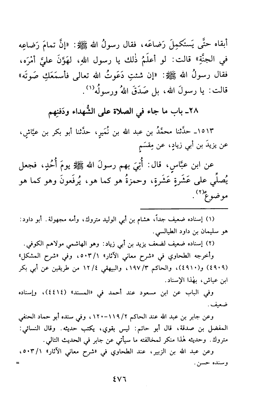 1513- حَدَّثَنَا مُحَمَّدُ بْنُ عَبْدِ اللهِ بْنِ نُمَيْرٍ ، حَدَّثَنَا أَبُو بَكْرِ بْنُ عَيَّاشٍ ، عَنْ يَزِيدَ بْنِ أَبِي زِيَادٍ ، عَنْ مِقْسَمٍ ، عَنِ ابْنِ عَبَّاسٍ ، قَالَ : أُتِيَ بِهِمْ رَسُولَ اللهِ صَلَّى الله عَليْهِ وسَلَّمَ يَوْمَ أُحُدٍ ، فَجَعَلَ يُصَلِّي عَلَى عَشَرَةٍ عَشَرَةٍ ، وَحَمْزَةُ هُوَ كَمَا هُوَ ، يُرْفَعُونَ , وَهُوَ كَمَا هُوَ مَوْضُوعٌ.