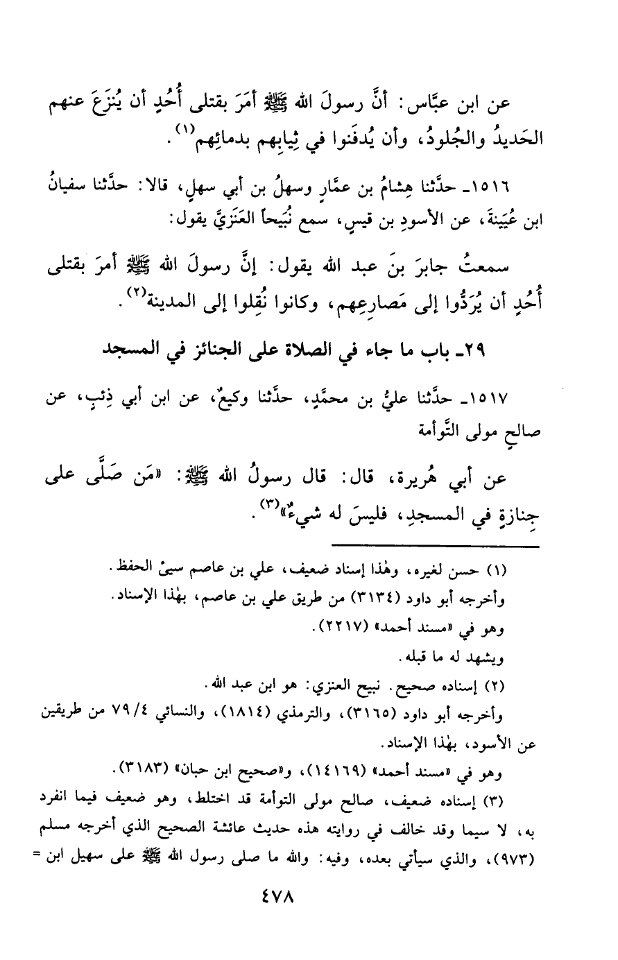 1516- حَدَّثَنَا هِشَامُ بْنُ عَمَّارٍ ، وَسَهْلُ بْنُ أَبِي سَهْلٍ ، قَالاَ : حَدَّثَنَا سُفْيَانُ بْنُ عُيَيْنَةَ ، عَنِ الأَسْوَدِ بْنِ قَيْسٍ ، سَمِعَ نُبَيْحًا الْعَنْزِيَّ يَقُولُ : سَمِعْتُ جَابِرَ بْنَ عَبْدِ اللهِ يَقُولُ : إِنَّ رَسُولَ اللهِ صَلَّى الله عَليْهِ وسَلَّمَ أَمَرَ بِقَتْلَى أُحُدٍ أَنْ يُرَدُّوا إِلَى مَصَارِعِهِمْ ، وَكَانُوا نُقِلُوا إِلَى الْمَدِينَةِ.