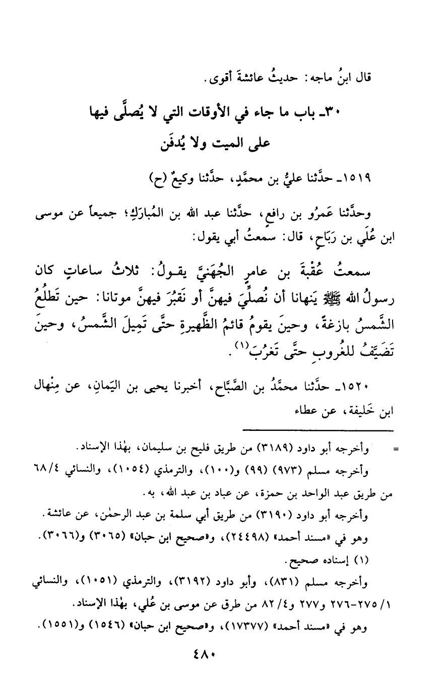 1519- حَدَّثَنَا عَلِيُّ بْنُ مُحَمَّدٍ ، حَدَّثَنَا وَكِيعٌ (ح) وحَدَّثَنَا عَمْرُو بْنُ رَافِعٍ ، حَدَّثَنَا عَبْدُ اللهِ بْنُ الْمُبَارَكِ ؛ جَمِيعًا عَنْ مُوسَى بْنِ عُلَيِّ بْنِ رَبَاحٍ ، قَالَ : سَمِعْتُ أَبِي يَقُولُ : سَمِعْتُ عُقْبَةَ بْنَ عَامِرٍ الْجُهَنِيَّ يَقُولُ : ثَلاَثُ سَاعَاتٍ كَانَ رَسُولُ اللهِ صَلَّى الله عَليْهِ وسَلَّمَ يَنْهَانَا أَنْ نُصَلِّيَ فِيهِنَّ , أَوْ نَقْبُرَ فِيهِنَّ مَوْتَانَا : حِينَ تَطْلُعُ الشَّمْسُ بَازِغَةً ، وَحِينَ يَقُومُ قَائِمُ الظَّهِيرَةِ حَتَّى تَمِيلَ الشَّمْسُ ، وَحِينَ تَضَيَّفُ لِلْغُرُوبِ حَتَّى تَغْرُبَ.