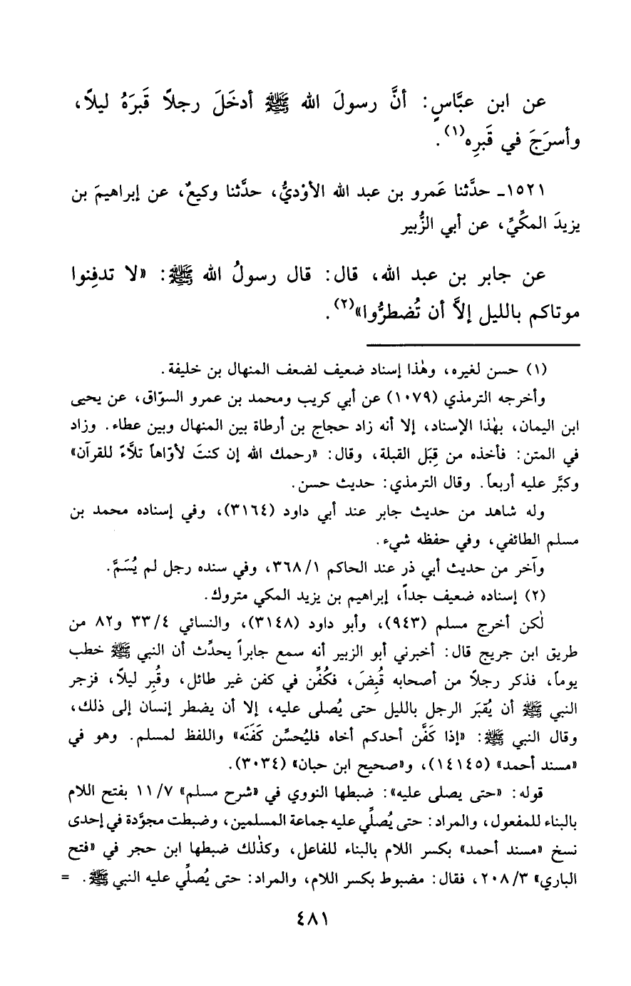 1521- حَدَّثَنَا عَمْرُو بْنُ عَبْدِ اللهِ الأَوْدِيُّ ، حَدَّثَنَا وَكِيعٌ ، عَنْ إِبْرَاهِيمَ بْنِ يَزِيدَ الْمَكِّيِّ ، عَنْ أَبِي الزُّبَيْرِ ، عَنْ جَابِرِ بْنِ عَبْدِ اللهِ ، قَالَ : قَالَ رَسُولُ اللهِ صَلَّى الله عَليْهِ وسَلَّمَ : لاَ تَدْفِنُوا مَوْتَاكُمْ بِاللَّيْلِ ، إِلاَّ أَنْ تُضْطَرُّوا.